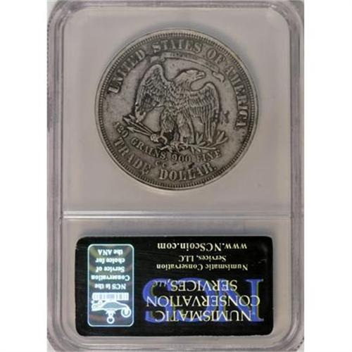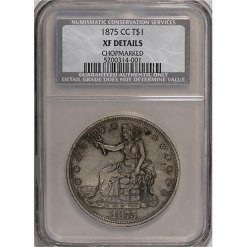 <B>1875-CC T$1 --Chopmarked--NCS.</B></I> <B>XF Details</B></I>. NGC Census: (0/0). PCGS Population (0/0). Mintage: 1,573,700. (#7038)<BR><BR><B>Coin Engraver:</B> William Barber<BR><BR><b>Shipping:</b> Coins & Currency (<a target="_blank" href="http://www.heritageauctions.com/common/shipping.php">view shipping information</a>)
