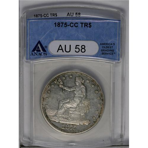 <B>1875-CC<T$1> AU58 ANACS.</B></I> Type Two Reverse. Luster is plentiful, and partly extends into the reverse field. Light tan-gold toning is limited to the margins. Suitable for an affordable quality Carson City type set.