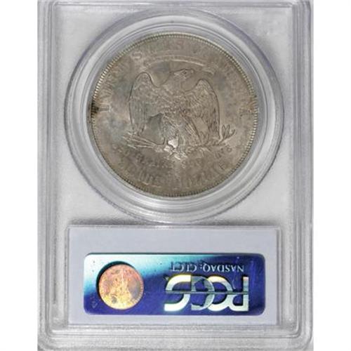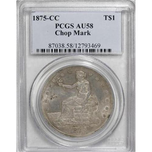 <B>1875-CC T$1 Chop Mark AU58 PCGS.</B></I> Type One Reverse. A solitary chop mark on the left obverse field causes a slight bulge opposite above the arrow heads. The obverse has a few faint hairlines, but marks are generally minor. Golden-brown and dove-gray with good luster and a whisper of highpoint friction.<BR><BR><b>Shipping:</b> Coins & Currency (<a target="_blank" href="http://www.heritageauctions.com/common/shipping.php">view shipping information</a>)
