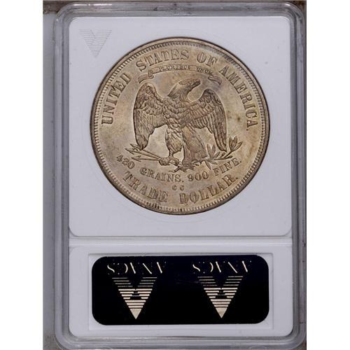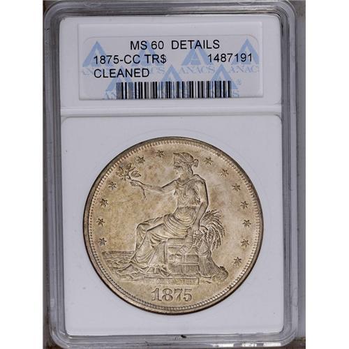 <B>1875-CC<T$1>--Cleaned--ANACS. MS60 Details.</B></I> Type One Reverse. A lightly hairlined golden-brown example with impressive mint sheen and no heavy bagmarks. The eagle's right (facing) leg is soft, but the remainder of the piece is sharply struck.