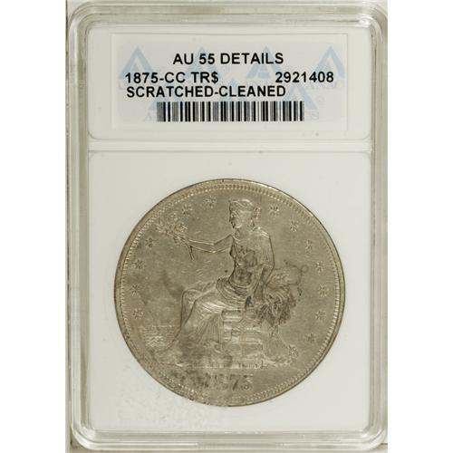 <B>1875-CC T$1 --Cleaned, Scratched--ANACS. AU55 Details.</B></I> NGC Census: (14/159). PCGS Population (30/166). Mintage: 1,573,700. Numismedia Wsl. Price: $358. (#7038)<BR><BR><b>Shipping:</b> Coins & Currency (<a target="_blank" href="http://www.heritageauctions.com/common/shipping.php">view shipping information</a>)
