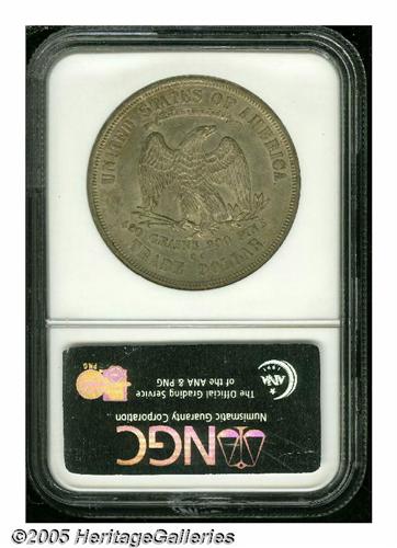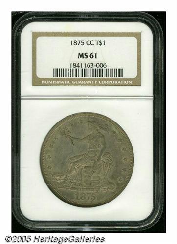 <B>1875-CC<T$1> MS61 NGC.</B></I> Type One Reverse. Deep orange surfaces with some mint-green around the rims. Typically preserved for the grade, with numerous light wisps, but nothing major. A small die-lump is seen on Liberty's outstretched arm.