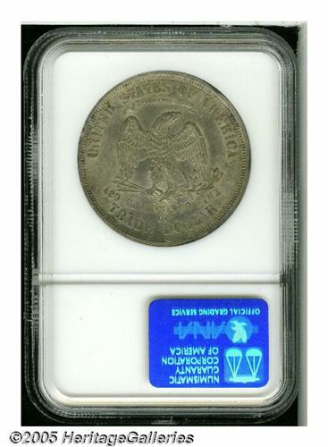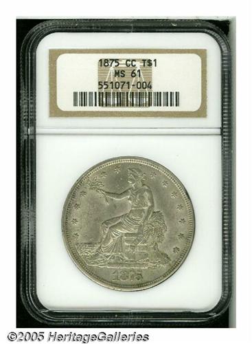 <B>1875-CC<T$1> MS61 NGC.</B></I> Type One Reverse. Somewhat soft on the eagle's right (facing) talons, and on Liberty's head, but well detailed otherwise, this example is lightly toned, with small amounts of mottled patina near some of the peripheries, decent luster, and relatively few small surface abrasions, for the assigned grade. Population: 27 in 61, 78 finer (5/05).