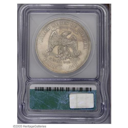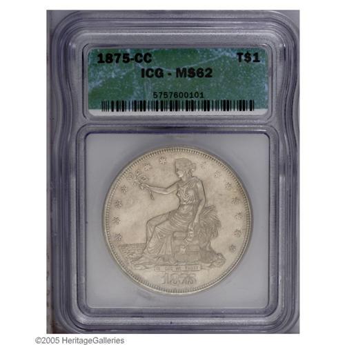<B>1875-CC<T$1> MS62 ICG.</B></I> Type One Reverse. Somewhat soft on the eagle's right (facing) talons, and on Liberty's head, but well detailed otherwise. This example is lightly toned, with steel-gray patina overall, slightly subdued luster, and relatively few small surface abrasions, for the assigned grade. An area of light russet is seen at the top of the reverse.