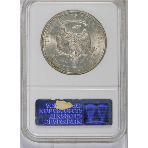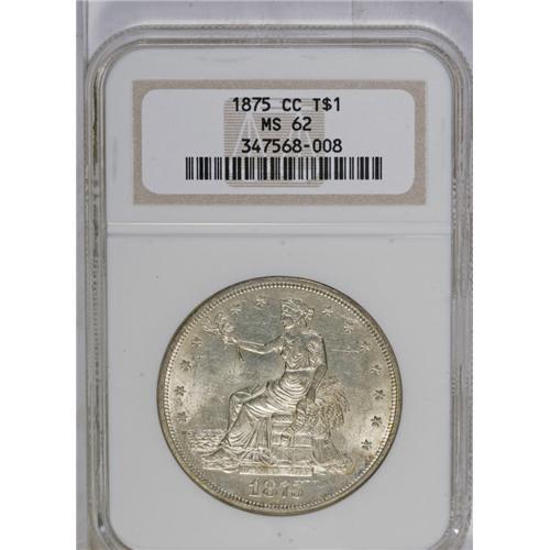 <B>1875-CC<T$1> MS62 NGC.</B></I> Type One Obverse and Reverse. A nicely struck piece with creamy luster. The silver-gray surfaces have scattered abrasions and small patches of dark gray patina at the periphery. Census: 35 in 62, 44 finer (8/06).<BR><I>From The Clifton Rodenburg Collection.</B></I>