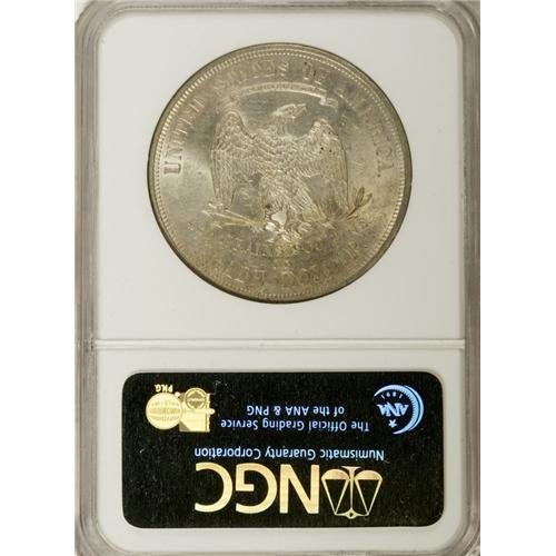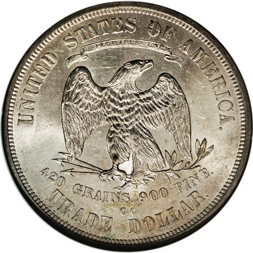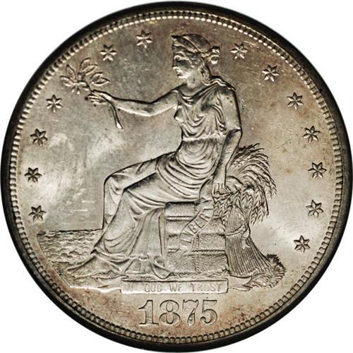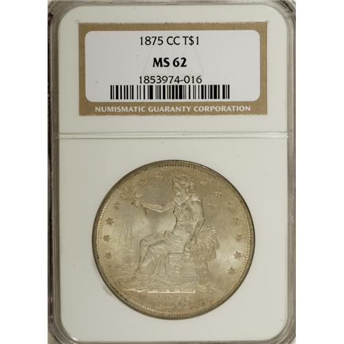 <B>1875-CC T$1 MS62 NGC.</B></I> Type One Reverse. A lustrous CC-mint Trade dollar whose chestnut-gray surfaces are clean aside from a few vertical lines on the left obverse field. The strike is crisp except for slightly blending on Liberty's hair and the eagle's right (facing) claw. Census: 37 in 62, 43 finer (1/07).<BR><BR><b>Shipping:</b> Coins & Currency (<a target="_blank" href="http://www.heritageauctions.com/common/shipping.php">view shipping information</a>)