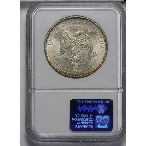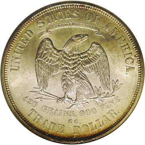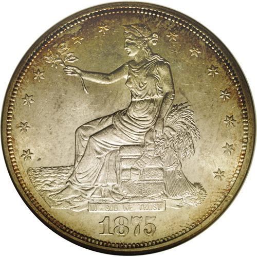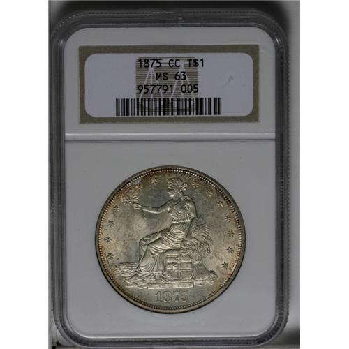 <B>1875-CC<T$1> MS63 NGC.</B></I> Type One Reverse. The 1875-CC is the most available Carson City Trade dollar, but is nonetheless seldom encountered with full cartwheel luster and relatively clean surfaces. The borders are golden-brown and sea-green, while the fields and devices are light tan-gray. Well struck save for trivial softness on the usual suspects: Liberty's hair and the eagle's right (facing) claw. Census: 24 in 63, 19 finer (5/06).<BR><I>From The Guadalupe Collection, Part Two.</B></I>