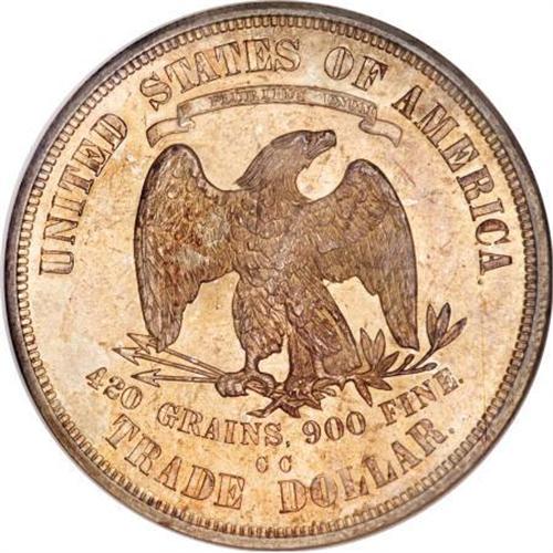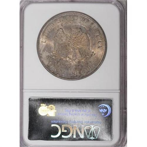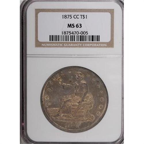<B>1875-CC T$1 MS63 NGC.</B></I> Type One Obverse, Type One Reverse. Medium CC. The 1875-CC is the most available Carson City Trade dollar, but that does not account for any substantial number of coins. Many were shipped to the Orient, and few were set aside in Uncirculated grades. At the MS63 grade level this is a real find for the Trade dollar specialist. The coin is sharply struck throughout, with rich, even reddish-golden toning, and the fields display slight semireflectivity. The light abrasions scattered over each side account for the grade but are generally not visible because of the toning. Census: 25 in 63, 20 finer (2/08).<BR><I>From The Queller Family Collection of Silver Dollars.</B></I><BR><BR><B>Coin Engraver:</B> William Barber<BR><BR><b>Shipping:</b> Coins & Currency (<a target="_blank" href="http://www.heritageauctions.com/common/shipping.php">view shipping information</a>)
