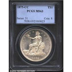 1875-CC T$1 MS63 PCGS. Type I Obverse / Type I Reverse. A lightly toned and lustrous representative that has just a few unimportant abrasions in the fields. Well struck on the stars and a majority of the devices, with slight softness of detail only on the right claw and the coronet of Liberty. The reverse is strongly strike doubled. The mintage of this issue was extensively circulated, and it is genuinely scarce in Uncirculated grades. The allure of the Carson City mintmark only adds to the demand for quality specimens. From the Andy Geosits Collection of Trade Dollars. Important notice: We expect to be auctioning lots at the rate of 200-250 per hour. Sometimes eBay Premier live bid software cannot keep up with that pace, so we strongly recommend that you place a realistic proxy bid now as insurance to avoid disappointment. Also please note that all Heritage/CAA lots purchased through eBay Premier carry a 20% Buyer's Premium. Please make sure you read the Terms and Conditions.