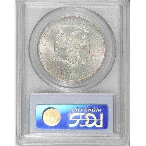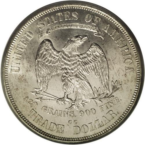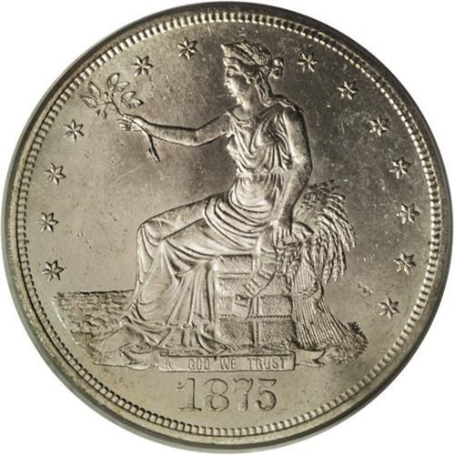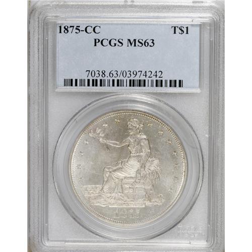 <B>1875-CC T$1 MS63 PCGS.</B></I> Type One Reverse. A berry shows beneath the left (right facing) claw. This high mintage Carson City representative displays bright luster and wisps of olive-green on the obverse, and lavender on the reverse. The design elements are well brought up, save for weakness in portions of Liberty's hair and on the eagle's left (right facing) claw. A scattering of minuscule marks define the grade. Population: 44 in 63, 22 finer (2/07).<BR><BR><b>Shipping:</b> Coins & Currency (<a target="_blank" href="http://www.heritageauctions.com/common/shipping.php">view shipping information</a>)