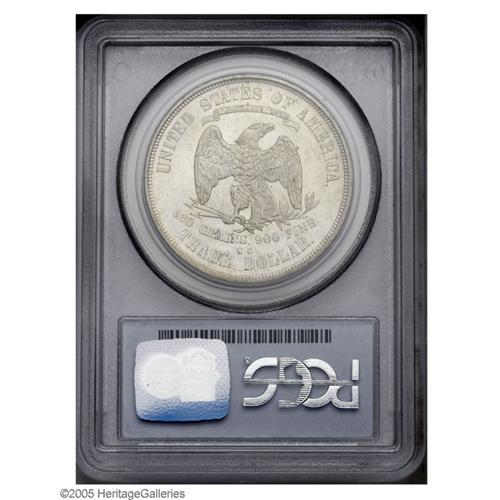 <B>1875-CC<T$1> MS64 PCGS.</B></I> Type One Reverse. Boldly struck, except for Liberty's head, with gleaming silver-gray surfaces that exhibit splashes of coral color on the obverse. A few wispy field marks and luster grazes define the grade. An attractive and desirable representative of this always-popular Carson City issue. Virtually unobtainable any finer, even though this is one of the two most plentiful Carson City Mint Trade Dollar issues. Although PCGS has certified 19 coins as MS64 or finer with another 18 certified by NGC, it is probably the case that these 37 submissions only represent about 12 to 15 different coins. Distinct doubling is apparent on most of the lower reverse lettering, but this is strike or machine doubling, and not an actual doubled die variety, even though such a coin is known. Population: 18 in 64, 1 finer (9/05).<BR><I>From The Jack Lee Collection, III</B></I>