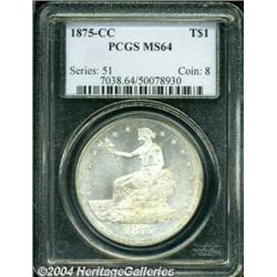 <table><tbody><tr><td><table> <TR><TD width="100%"><TABLE cellSpacing=1 cellPadding=3 width="100%" border=0><TBODY><TR><TD width="100%" bgColor=#79735c><FONT face=arial color=#ffffff size=3><B>Description</B> </FONT></TD></TR><TR><TD width="100%" bgColor=#ffffff><FONT face=arial size=2><B>1875-CC T$1 MS64 PCGS.</B></I> Type One Reverse. The third and clearly the finest of three examples in the sale, this essentially brilliant '75-CC gains instant appeal with its bright cartwheel sheen and ultra frosty features. Scattered field marks and a reeding mark on Liberty arm rule out the possibility of Gem status, but do not diminish the coin's admirable appearance. Population: 15 in 64, 1 finer (10/03). </FONT></TD></TR></TBODY></TABLE></TD></TR></TBODY></TABLE><BR><A name=PricesRealized></A><TABLE cellSpacing=0 cellPadding=0 width="100%" bgColor=#000000 border=0><TBODY><TR><TD width="100%"><TABLE cellSpacing=1 cellPadding=3 width="100%" border=0><TBODY><TR><TD width="100%" bgColor=#79735c><A name=PR><FONT face=arial color=#ffffff size=3><B>Previous Prices from Heritage Auctions</B> </FONT></A></TD></TR><TR><TD bgColor=#f6f6ed><TABLE cellSpacing=0 cellPadding=0 width="100%" border=1><TBODY><TR><TD align=middle width="33%"><B>Date</B></TD><TD align=middle width="33%"><B>Service</B></TD><TD align=middle width="33%"><B>Price</B></TD></TR><TR bgColor=whitesmoke><TD width="33%"><B>09/28/2002</B></TD><TD width="33%">PCGS</TD><TD width="33%">$7,762.50</TD></TR><TR bgColor=whitesmoke><TD width="33%"><B>08/08/2001</B></TD><TD width="33%">NGC</TD><TD width="33%">$4,830.00</TD></TR><TR bgColor=whitesmoke><TD width="33%"><B>08/13/1999</B></TD><TD width="33%">NGC</TD><TD width="33%">$6,037.50</TD></TR><TR bgColor=whitesmoke><TD width="33%"><B>05/01/1995</B></TD><TD width="33%">NGC</TD><TD width="33%">$3,960.00</TD></TR><TR bgColor=whitesmoke><TD width="33%"><B>01/08/2002</B></TD><TD width="33%">PCGS</TD><TD width="33%">$12,650.00</TD></TR></TBODY></TABLE></TD></TR><TR><TD bgColor=#ffffff><FONT face=arial size=1 ?>PLEASE NOTE: All prices realized reflect the final hammer price PLUS the buyer's premium in auctions that charge a buyer's premium. Each item has a notation at the top of the listing indicating whether that lot included a buyer's premium. Example: A item that sells with a final hammer price of $100 and a 20% buyer's premium will display with a price realized of $120. All information listed is intended to be as accurate as possible, but errors are possible. Please use this guide carefully and inform us of any inaccuracies. </FONT></TD></TR></TBODY></TABLE></TD></TR></TBODY></TABLE><BR><TABLE cellSpacing=0 cellPadding=0 width="100%" bgColor=#000000 border=0><TBODY><TR><TD width="100%"><TABLE cellSpacing=1 cellPadding=3 width="100%" border=0><TBODY><TR><TD width="100%" bgColor=#79735c colSpan=6><FONT face=arial color=#ffffff size=3><B>Price Guide*</B> </FONT></TD></TR><TR bgColor=#f6f6ed><TD align=middle><B>Grade</B> </TD><TD align=middle><B>Coin World<BR>(Trends)</B> </TD><TD align=middle><B>Numismedia<BR>Retail</B> </TD><TD align=middle><B>Numismedia<BR>Wholesale</B> </TD><TD align=middle><B>Coin<BR>Universe</B> </TD><TD align=middle><B>Heritage<BR>Value Index</B> </TD></TR><TR bgColor=#ffffff><TD align=middle>63</TD><TD align=right>$3,300.00</TD><TD align=right>---</TD><TD align=right>$2,175.00</TD><TD align=right>$2,600.00</TD><TD align=right>$2,105.63</TD></TR><TR style="FONT-WEIGHT: bold" bgColor=#cccfdd><TD align=middle>64</TD><TD align=right>$10,000.00</TD><TD align=right>---</TD><TD align=right>$5,975.00</TD><TD align=right>$7,150.00</TD><TD align=right>$6,483.13</TD></TR><TR bgColor=#ffffff><TD align=middle>65</TD><TD align=right>---</TD><TD align=right>---</TD><TD align=right>---</TD><TD align=right>---</TD><TD align=right>$18,000.00</TD></TR><TR bgColor=#ffffff><TD colSpan=6><FONT size=1>*All information listed is intended to be as accurate as possible, but errors are possible. No item may be returned or refused based on this information which is provided as a service to our customers. You should contact each pricing source directly to determine the accuracy of this information. </FONT></TD></TR></TBODY></TABLE></TD></TR></TBODY></TABLE><BR><TABLE cellSpacing=0 cellPadding=0 width="100%" bgColor=#000000 border=0><TBODY><TR><TD width="100%"><TABLE cellSpacing=1 cellPadding=3 width="100%" border=0><TBODY><TR><TD width="100%" bgColor=#79735c><FONT face=arial color=#ffffff size=3><B>Population Guide</B> </FONT></TD></TR><TR bgColor=#ffffff><TD align=middle><!-- Begin Output of Population Grid--><TABLE cellSpacing=0 cellPadding=0 width="100%" border=0><TBODY><TR><TD vAlign=center><TABLE cellSpacing=0 width="100%" border=1 cellsadding="3"><TBODY><TR><TD vAlign=center><TABLE cellSpacing=0 cellPadding=3 width="100%" border=1><TBODY><TR><TD vAlign=center align=middle bgColor=#f0f1e8 colSpan=2 <CENTER><FONT face=Arial size=2><B>PCGS Pop </B></FONT><CENTER></CENTER></TD><TD vAlign=center align=middle bgColor=#f0f1e8 colSpan=2><CENTER><FONT face=Arial size=2><B>NGC Pop</B></CENTER></FONT></TD></TR><TR><TD vAlign=center><FONT face=Arial size=2>(64)</FONT> </TD><TD vAlign=center align=right><FONT face=Arial size=2>15</FONT> </TD><TD vAlign=center><FONT face=Arial size=2>(64)</FONT> </TD><TD vAlign=center align=right><FONT face=Arial size=2>17</FONT> </TD></TR><TR><TD vAlign=center><FONT face=Arial size=2>(>64)</FONT> </TD><TD vAlign=center align=right><FONT face=Arial size=2>1</FONT> </TD><TD vAlign=center><FONT face=Arial size=2>(>64)</FONT> </TD><TD vAlign=center align=right><FONT face=Arial size=2>3</FONT> </TD></TR></TBODY></TABLE></TD></TR></TBODY></TABLE></TD></TR></TBODY></TABLE><!-- End Output of Population Grid--></TD></TR></TBODY></TABLE></TD></TR></TBODY></TABLE><BR><TABLE cellSpacing=0 cellPadding=0 width="100%" bgColor=#000000 border=0><TBODY><TR> <font color='#000000'><span style='background-color: #FFFFFF'><td bgcolor='#FFFFFE'> Important notice: Heritage usually auctions material at the r