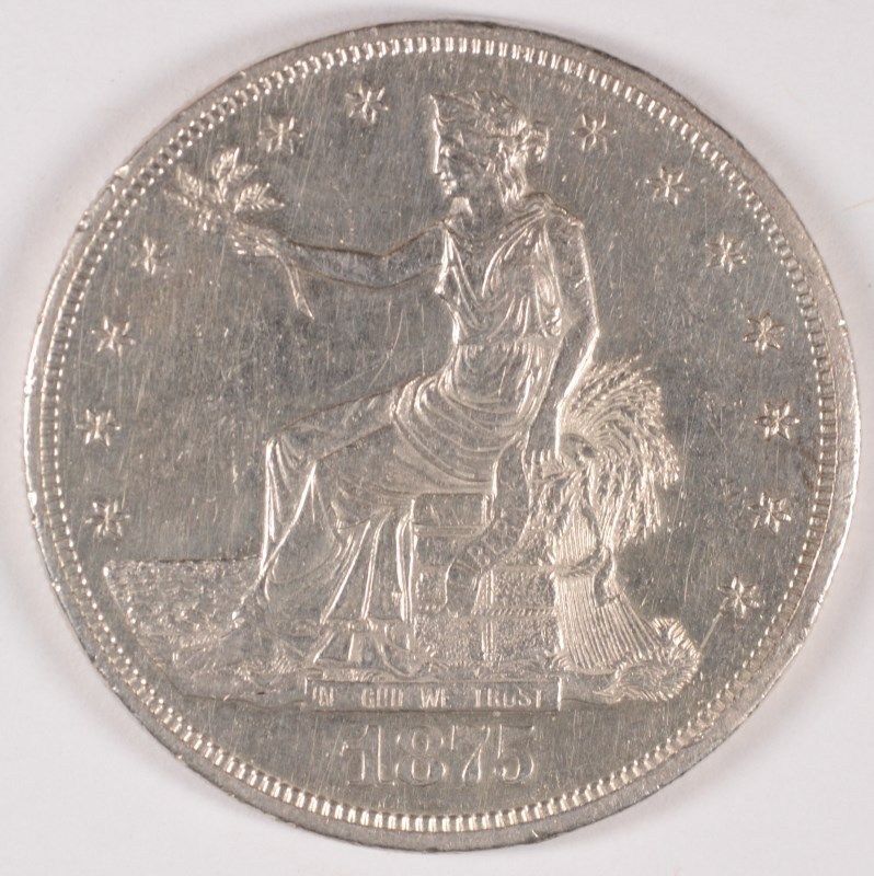 1875-CC TRADE DOLLAR, AU-58, RARE CARSON CITY MINT!