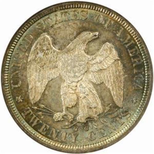<style type="text/css"> body, td, th { font-family: Arial, Helvetica, sans-serif; font-size: 12px; color: #482424; margin: 0px; padding: 0px; } #header { background-image: url(http://www.bowersandmerena.com/ebay/images/template_v3_01.gif); clear: both; background-color: #590303; border-top-width: 2px; border-top-style: solid; border-top-color: #B38C4F;}#header #header_wrapper { height: 75px; clear: both; width: 800px; margin-right: auto; margin-left: auto; background-image: url(http://www.bowersandmerena.com/ebay/images/template_v3_03.gif); background-repeat: no-repeat; background-position: right; color: #F3EDCC;}#header #header_wrapper #header_logo { float: left; height: 75px; width: 444px; background-image: url(http://www.bowersandmerena.com/ebay/images/template_v3_02.gif); background-repeat: no-repeat; font-size: 10px; text-transform: capitalize; color: #B38C4F;}#header #header_wrapper #header_right { float: left; height: 75px; width: 356px; text-align: right;}#header #header_wrapper #header_right #headerLoginBtn { margin-bottom: 30px;}#header #header_wrapper #header_right input#txtSearch { color: #B49056; border: 1px solid #B49056; width: 175px; padding-top: 3px; padding-right: 3px; padding-bottom: 4px; padding-left: 3px;}#nav { height: 37px; background-image: url(http://www.bowersandmerena.com/ebay/images/template_v3_05.gif); clear: both;}#nav #nav_wrapper { height: 35px; width: 800px; margin-right: auto; margin-left: auto; border-left-width: 1px; border-left-style: solid; border-left-color: #B38C4F;}#nav #nav_wrapper a { padding-right: 15px; padding-left: 15px; border-right-width: 1px; border-right-style: solid; border-right-color: #B38C4F; height: 25px; padding-top: 10px; display: block; float: left; text-decoration: none; font-weight: bold; color: #5D0303;}#nav #nav_wrapper a:hover { color: #B38C4F;}#nav #nav_wrapper #search { float: right; padding-top: 7px;}#nav #nav_wrapper #search #txtSearch { font-family: Arial, Helvetica, sans-serif; font-size: 10px; text-transform: uppercase; color: #D2AE75; border: 1px solid #B38C4F; padding: 3px;}#content_bgd { background-image: url(http://www.bowersandmerena.com/ebay/images/template_v3_09.gif); background-repeat: repeat-y; background-position: center; padding-top: 15px; padding-bottom: 15px; background-color: #FBFBDB;}#content_wrapper { clear: both; height: auto; width: 800px; margin-right: auto; margin-left: auto;}.LotDetailWhite{ line-height:normal; font-size:13px; font-family: arial,helvetica,sans-serif; color: White; font-weight: bold;}.LotDetailInformation{ line-height:normal; font-size: 13px; font-family: arial,helvetica,sans-serif;}.LotDetailMessage{ line-height:normal; font-size: 13px; font-family: arial,helvetica,sans-serif; color: red;}}tr.HeaderAuctionTitle td { color: #000000; font-weight: bold; padding: 2px; background-image: url(http://www.bowersandmerena.com/ebay/images/template_v3_05.gif); background-repeat: repeat-x; border-bottom-width: 1px; border-bottom-style: solid; border-bottom-color: #B38C4F;}table.AuctionSummary a, table.AuctionSummary a:link, table.AuctionSummary a:visited { color: #0000FF; text-decoration: none;}}td.tableHeaderLeft { border-left-width: 1px; border-left-style: solid; border-left-color: #B38C4F;}td.tableHeaderRight { border-right-width: 1px; border-right-style: solid; border-right-color: #B38C4F;}td.tableCellMiddle { border-left-width: 1px; border-left-style: solid; border-left-color: #B38C4F; border-right-width: 1px; border-right-style: solid; border-right-color: #B38C4F; padding: 5px;}tr.footer td { border-top-width: 1px; border-top-style: solid; border-top-color: #B38C4F;}</style></head><body><div id="header"> <div id="header_wrapper"> <div id="header_logo"> </div> <div id="header_right"> </div> </div></div><div id="nav"> <div id="nav_wrapper"> <a href="http://www.bowersandmerena.com">Our eBayLive Auctions</a> <a href="#PaymentInfo">Payment Information</a> <a href="#ShippingInfo">Shipping Information</a> <a href="#About">About Bowers and Merena</a> </div></div><div id="content_bgd"> <div id="content_wrapper"> <table width="100%" border="0" cellpadding="5" cellspacing="0" class="AuctionSummary"> <tbody> <tr class="HeaderAuctionTitle" style="height: 25px;"> <td align="left" class="tableHeaderLeft" > </td> <td align="center" class="tableHeaderRight"> <span style="font-size: large;">Lot #490. 1875-CC Twenty-Cent Piece. MS-66 (NGC).</span> </td> </tr> <tr> <td colspan="3" class="tableCellMiddle"> There are only two Carson City Mint issues in the short-lived Twenty-Cent series of 1875-1878. The 1876-CC is a major numismatic rarity with only a handful of examples known. That leaves the 1875-CC as the only realistic option for most mintmarked type collectors. While this issue is certainly more obtainable than the 1876-CC, it is still scarce in the finer circulated grades and quite rare in Mint State.An exceptionally well-preserved, top-of-the-pop Gem, this Condition Census piece belongs in the finest numismatic holding. Both sides are richly and originally toned with iridescent cobalt-blue highlights around the peripheries. The central obverse is mostly antique-copper in tone, while the corresponding area on the reverse is more-or-less brilliant. Full satin luster is seen throughout, but we are unable to locate a single bothersome or grade-limiting abrasion. Well struck for the type, with just a touch of softness to the central highpoint detail that is so minor as to be easily overlooked. Unsurpassable technical quality in an example of this conditionally challenging CC-mint issue.