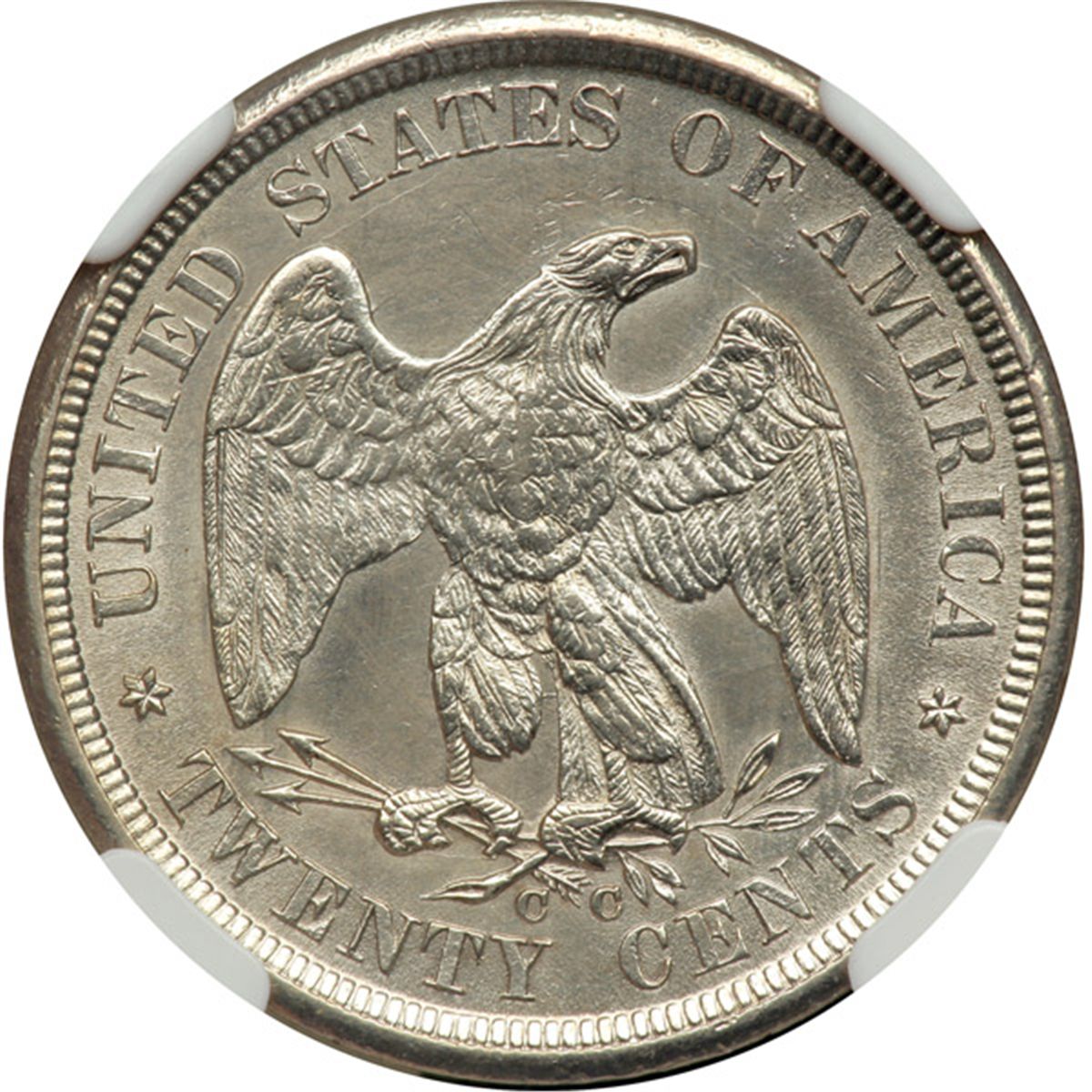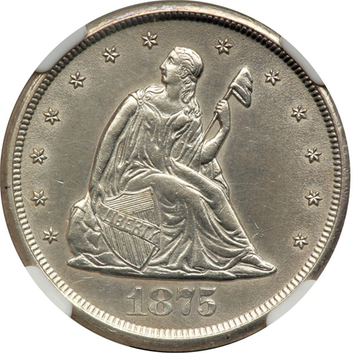1875-CC Twenty Cents. NGC Unc Details, improperly cleaned. Untoned. Of the two Carson City Mint dates in the Twenty Cent series, 1875-CC is the only truly affordable one. Most of the 1876-CC production was destroyed and specimens are great rarities. For 1875-CC, mintage is 133,290 pieces.