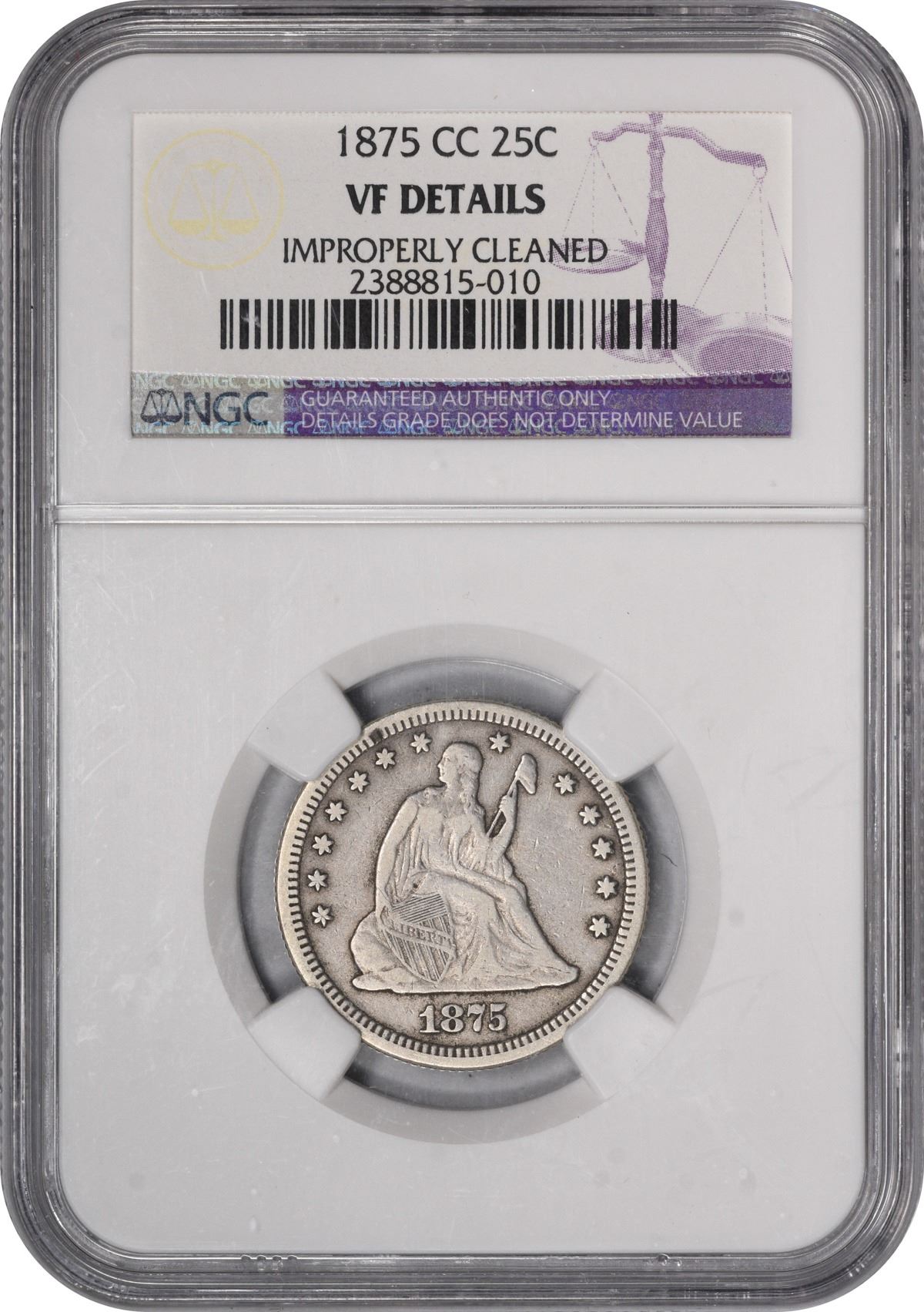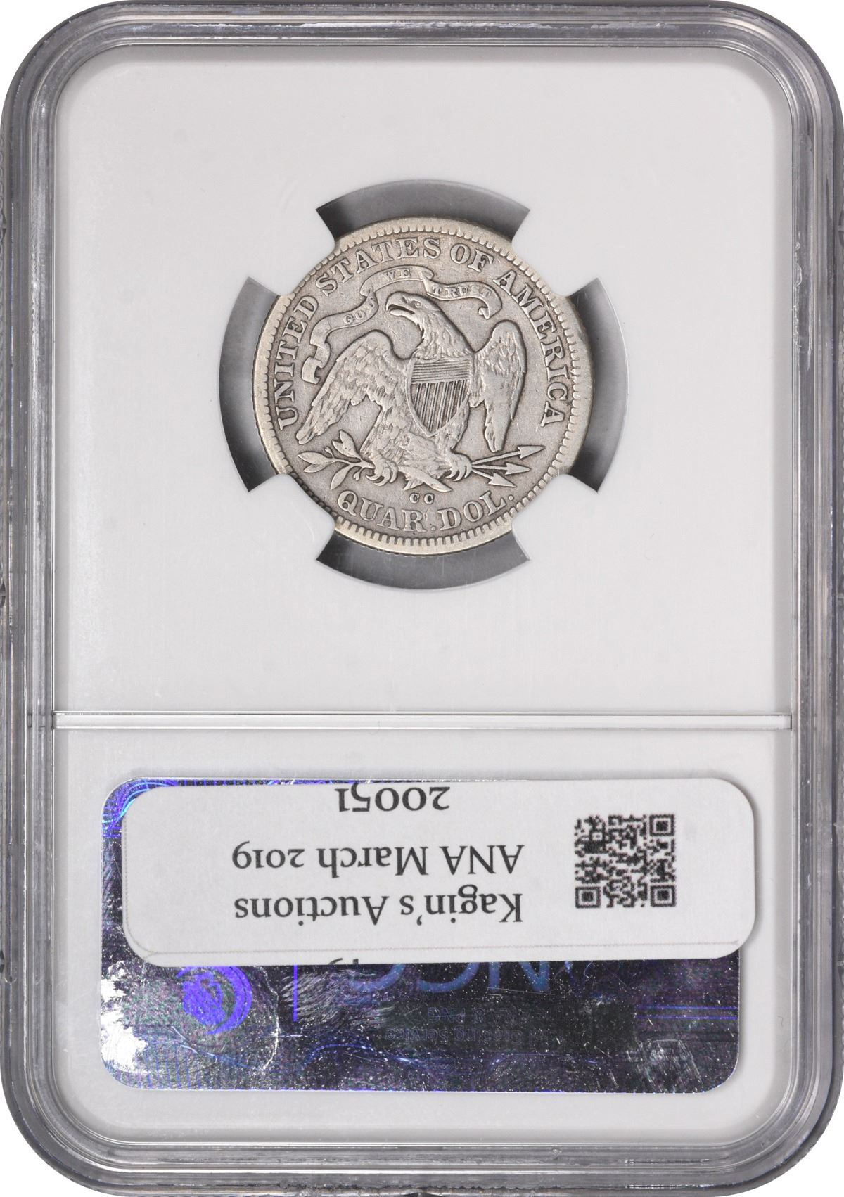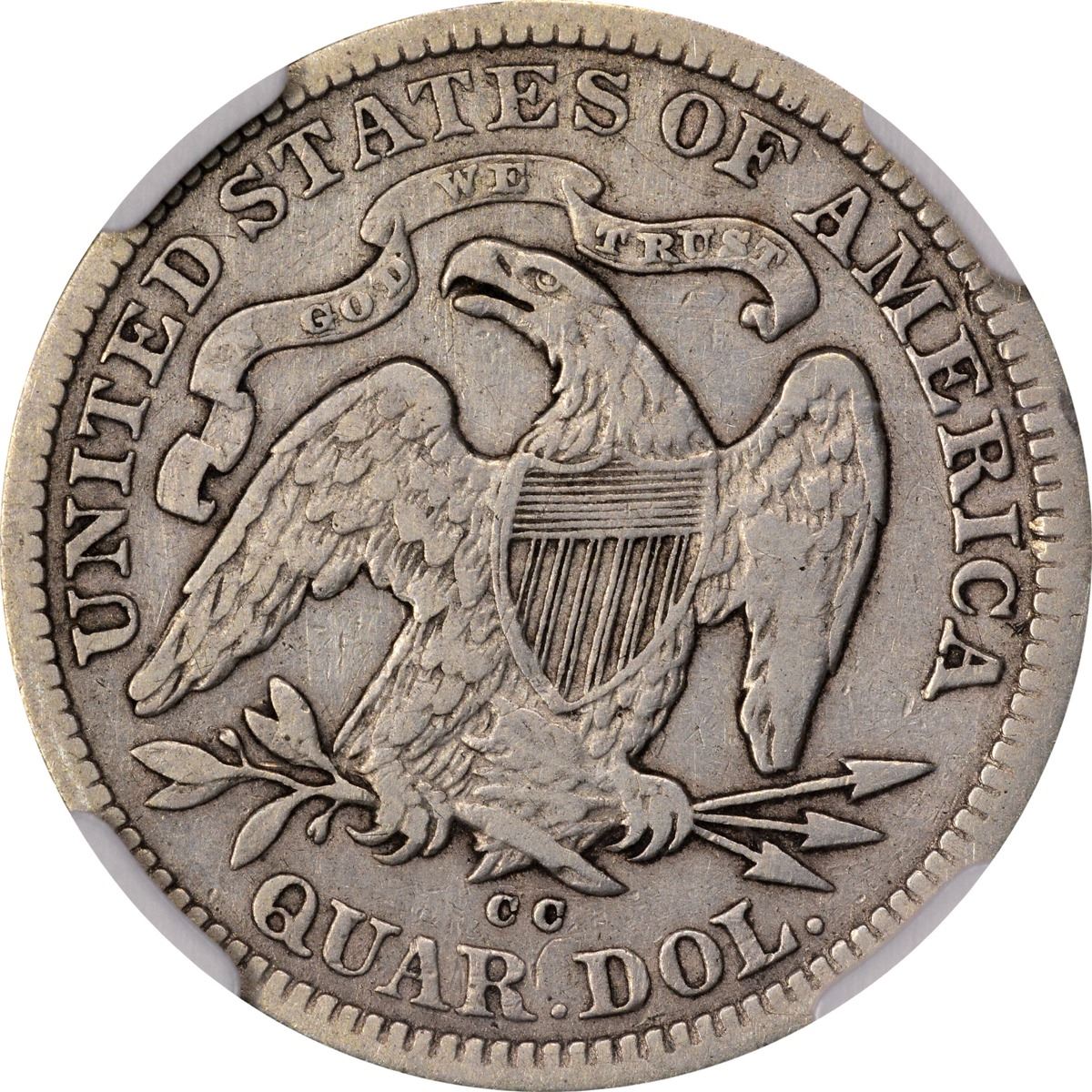 The medium steel-gray surfaces offer lilac highlights and freedom from unsightly contact marks. Though a bright light reveals some hairlines from a light and no doubt yesteryear cleaning, the surfaces are recovering nicely with time. We note a toning spot at an obverse dentil at 11 o’clock that earmarks this specimen easily for future research. The 1875-CC quarter represents the first date of the denomination from that mint with a Red Book value in the G-4 column smaller than $1,000! This specimen is finer overall than words can convey, and we expect a lot of collector participation when this semi-key branch mint quarter comes up for bids.
