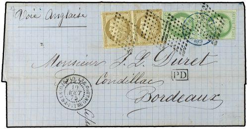 1875 Entire to Bordeaux franked imperf pairs 5c & 30c, both cut into, tied by dotted lozenge & blue "Colonies Fra. V. Ang." cds. Obverse also bears Pointe-A-Pitre * Paq. Ang. cds.