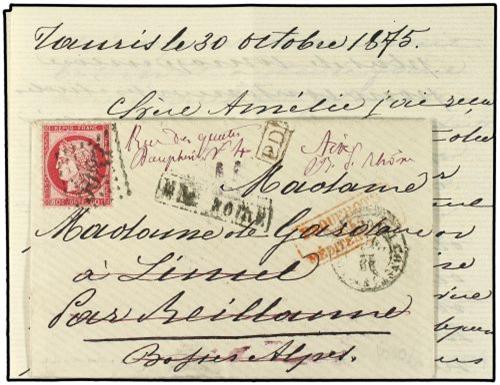 1875 Envelope to FRANCE with contents written from TAURIS 30th October 1875, routed via Trebizonde with boxed MER NOIRE and forwarded from Constantinople bearing France Ceres 80 c rose (Yvert 57) tied by 5083 gross chifres, with boxed PD, sent on French steamer with PAQUEBOTS DE LA MEDITERRANIE applied in red, on reverse MARSEILLE and AIX arrival. Scarce item of mail from Persia.