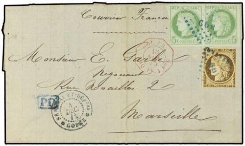 1875 Envelope written from COTONEU, Dahomey 21st October 1875 endorsed "Courier Francaise" sent by French paquebot to Goree with octagonal COL. FR. PAQ. FR. J. Nº 6 datestamp 18 NOV in red (Salles 1088) and forwarded to Dakar bearing French General Colonies 40 c orange (Yvert 13) and 5 c green (pair) (Yvert 17) tied by GOR in dotted lozange with adjacent GOREE SENEGAL ET DEP 4 DEC datestamp with boxed PD, sent from Dakar on French paquebot RIO GRANDE with COL. FR. PAQ. FR. J. Nº 6 datestamp 18 DEC in blue (Salles 1088), routed via Bourdeaux with MARSEILLE arrival. Very rare early item of mail from Dahomey.