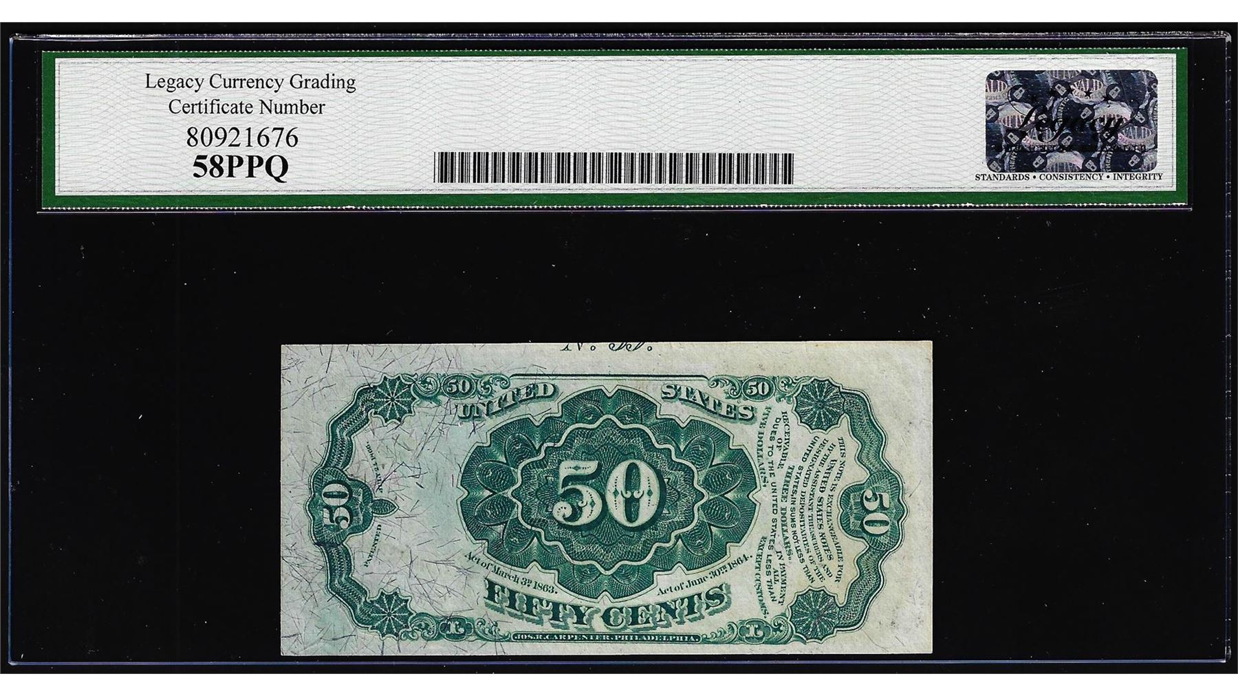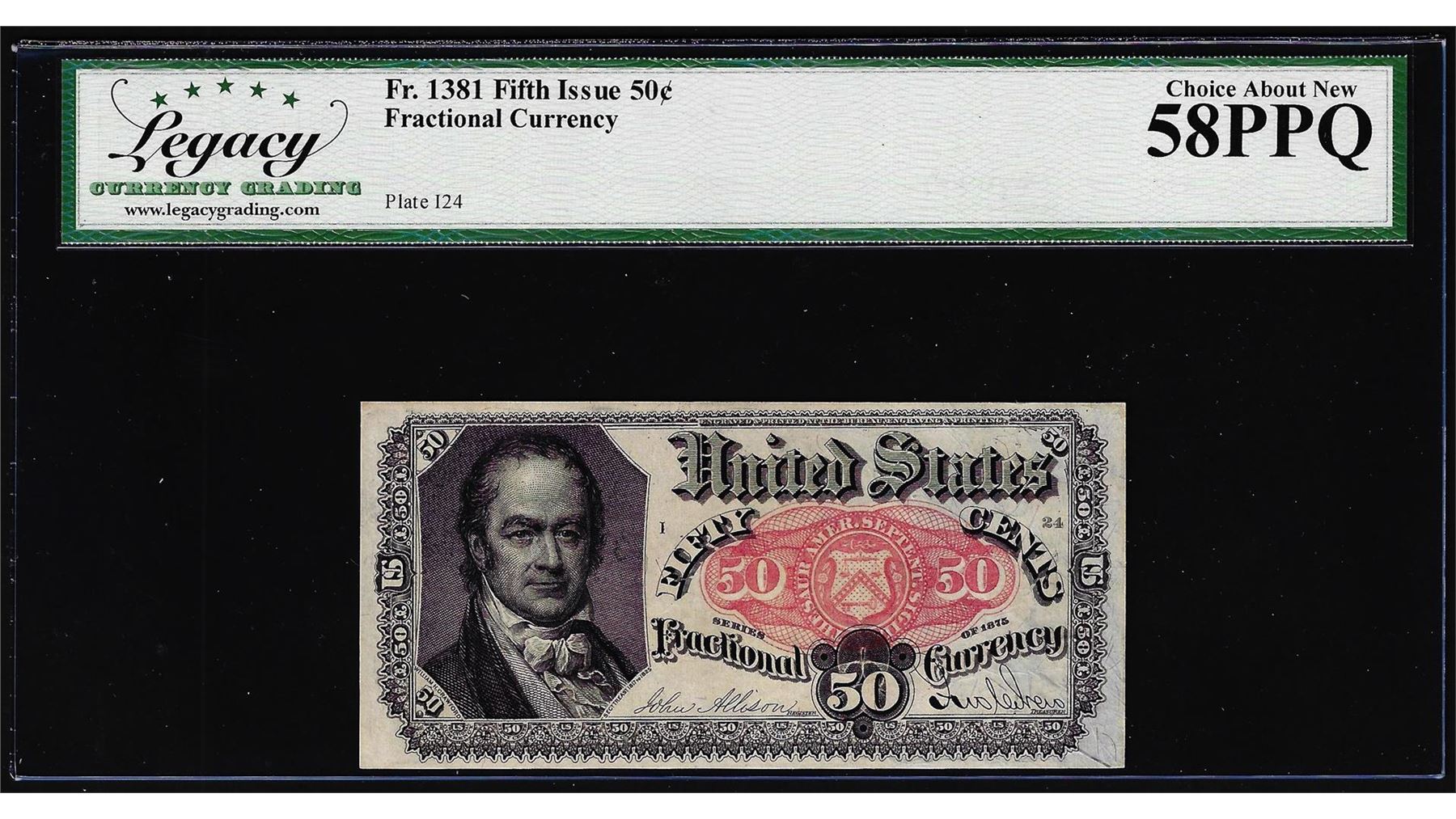 One 1875 Fifth Issue 50 Cent Fractional Currency Note Fr.1381 Legacy Choice About New 58PPQ. Legacy Graded.