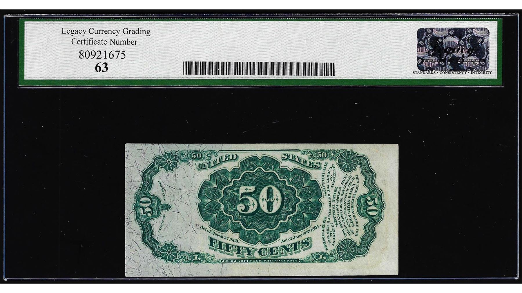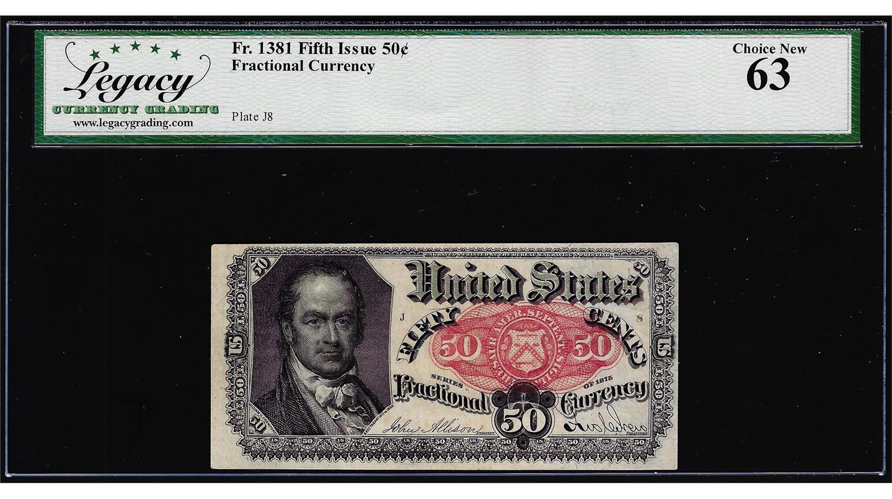 One 1875 Fifth Issue 50 Cent Fractional Currency Note Fr.1381 Legacy Choice New 63. Legacy Graded.