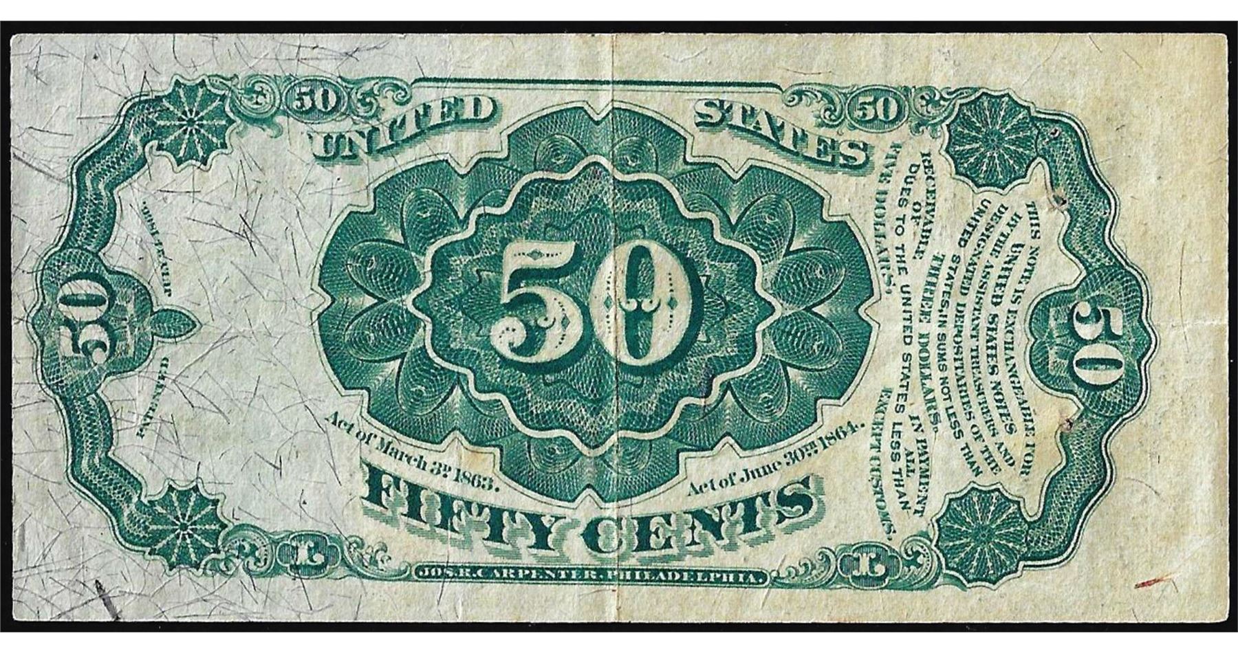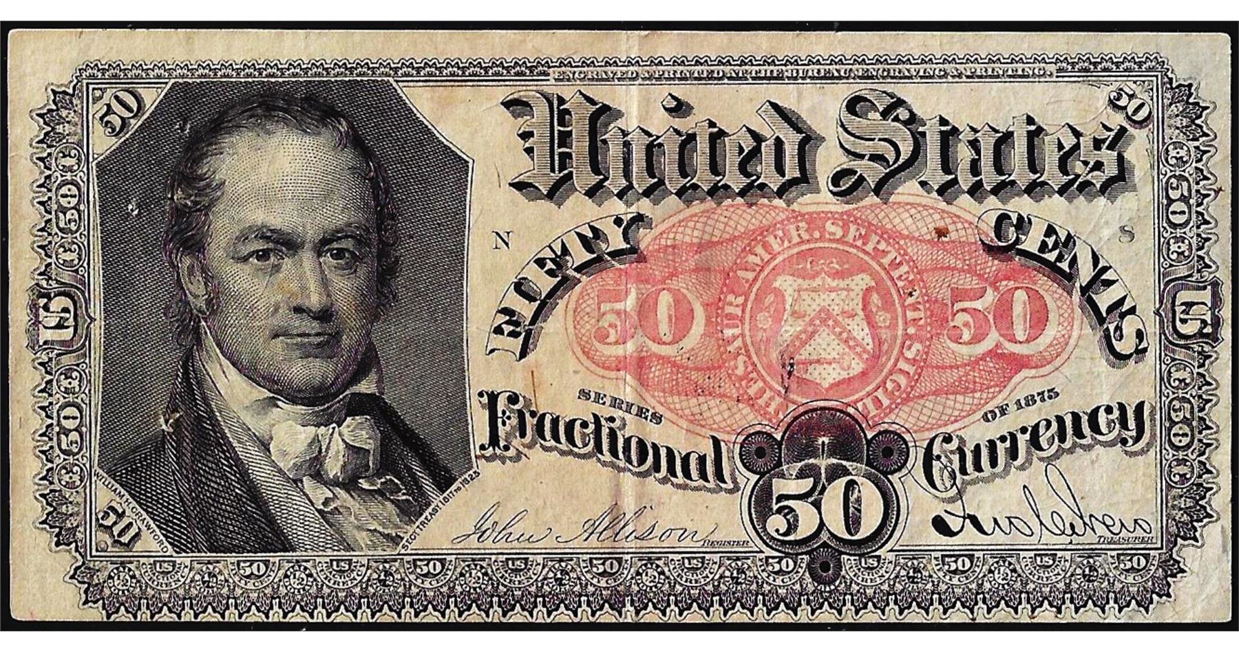 One 1875 Fifth Issue Fifty Cents Fractional Currency Note.