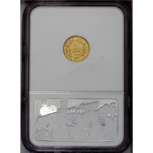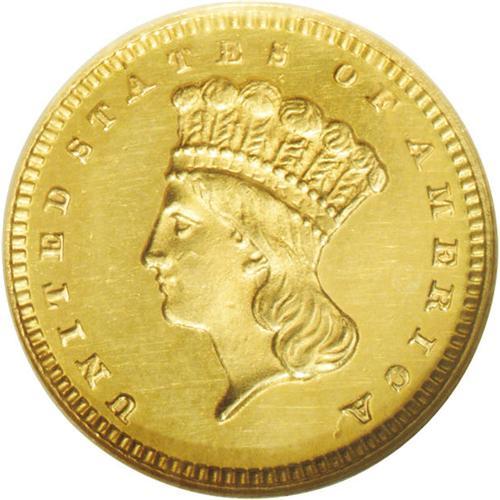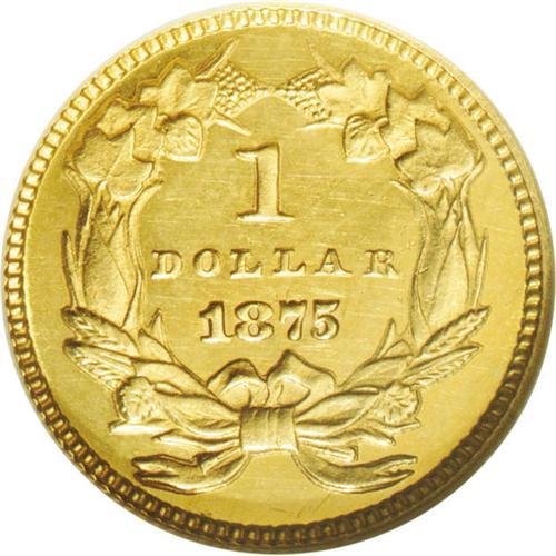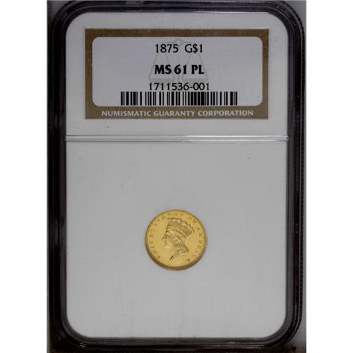 <B>1875 G$1 MS61 Prooflike NGC.</B></I> This is one of the important rarities within the gold dollar series. Total mintage of gold dollars for the year was just 420 coins, and mint records indicate that there were 400 business strikes and 20 proofs. Unlike certain other years, the business strikes and proofs of this date are easily distinguished. All business strikes, many which are deeply prooflike like this example, have a sharp spine down from the bottom edge of the chin, just left of the neck. This short spine is parallel to the leading edge of the neck. Proofs do not share this characteristic. This example has bright greenish-gold color. A few minor blemishes, including thin scratches on the reverse, limit the grade of this small gold coin.