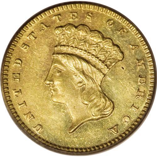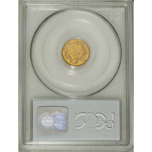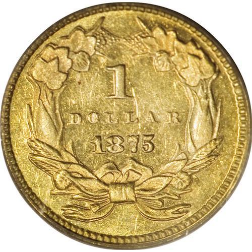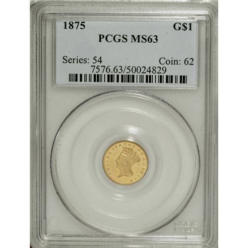 <B>1875 G$1 MS63 PCGS.</B></I> The 1875 gold dollar comes with a mintage of 400 business strikes and 20 proofs, making it one of the most desirable coins in the series. PCGS and NGC have certified about 60 business strikes, with the majority falling into the About Uncirculated to MS62 grade range.<BR> Attractive green-gold patination envelops the Select example offered in the current lot. Highly prooflike fields, which are typical for the date, yield strong contrast with the mildly frosted devices. An impressive strike imparts sharp definition to the design elements, including all of the letters in LIBERTY. Minute handling marks in the fields preclude an even higher grade. The reverse is rotated a few degree counterclockwise.<BR><BR><b>Shipping:</b> Coins & Currency (<a target="_blank" href="http://www.heritageauctions.com/common/shipping.php">view shipping information</a>)