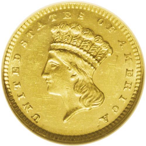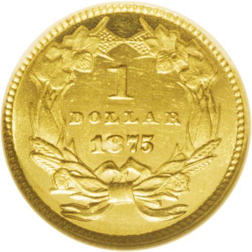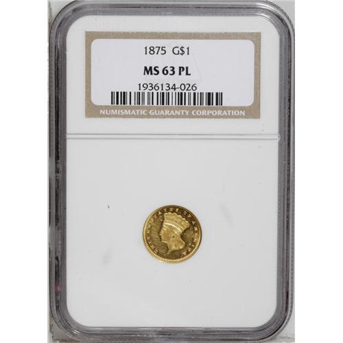 <B>1875<G$1> MS63 Prooflike NGC.</B></I> This is one of the most important dates within the gold dollar series. Total mintage of gold dollars for the year 1875 was just 420 coins, and mint records indicate that there were 400 business strikes and 20 proofs. Unlike certain other years, the business strikes and proofs of this date are easily distinguished. All business strikes, many which are prooflike like this example, have a sharp spine down from the bottom edge of the chin, just left of the neck. This short spine is parallel to the leading edge of the neck. Proofs do not share this characteristic. This example has rich greenish-gold color. A few minor blemishes, including faint pinscratches on each side, limit the grade of this small gold coin.<BR><I>From The Derrick Snider Collection.</B></I>