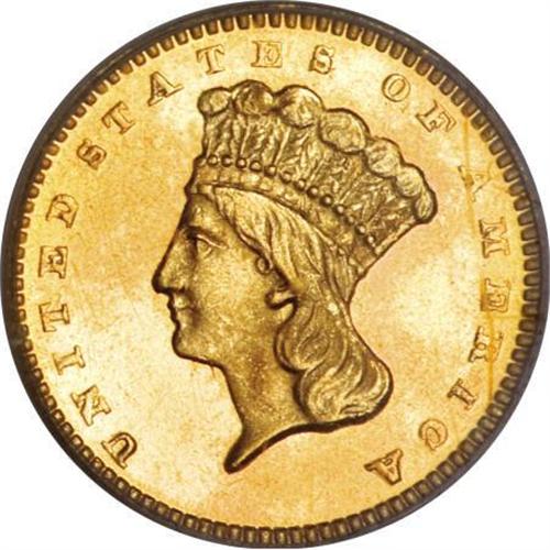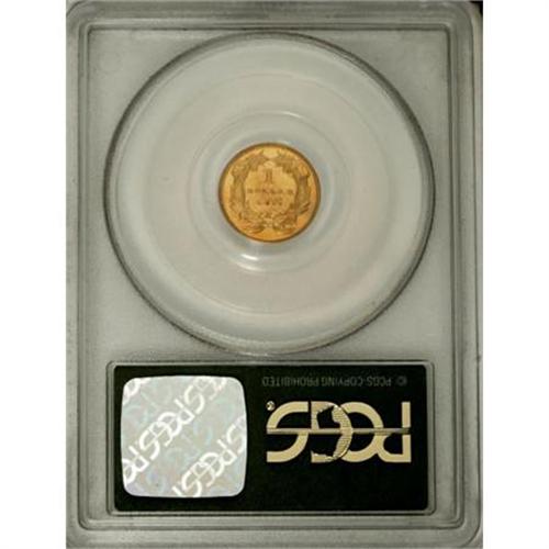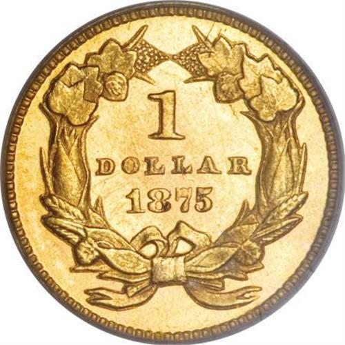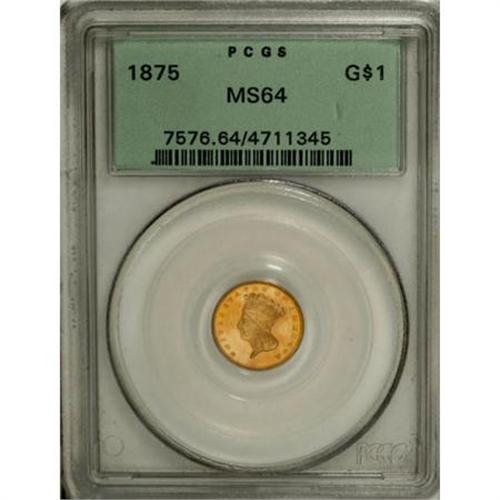 <B>1875 G$1 MS64 PCGS.</B></I> With the exception of the double eagle, all Philadelphia Mint 1875 gold denominations have remarkably low mintages. In particular, the three dollar, eagle, and half eagle are extreme rarities. The quarter eagle and gold dollar are collectible, but their business strike mintages of 400 pieces each will make the task arduous. Given its tiny emission, it comes as little surprise that the present near-Gem representative is prooflike. The peach-gold toning is beautiful, and the strike is exemplary aside from minor inexactness on the C in AMERICA. Encased in a green label holder. Population: 9 in 64, 10 finer (12/07).<BR><I>From The Jimmy G. Collection.</B></I><BR><BR><B>Coin Engraver:</B> James B. Longacre<BR><BR><b>Shipping:</b> Coins & Currency (<a target="_blank" href="http://www.heritageauctions.com/common/shipping.php">view shipping information</a>)