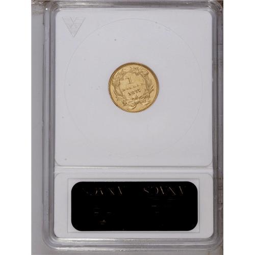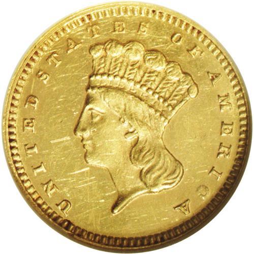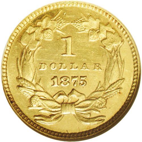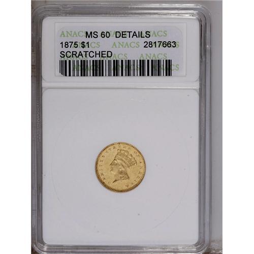 <B>1875 G$1 --Scratched--ANACS. MS60 Details.</B></I> Aside from the business strike double eagle, all gold coins from the Philadelphia Mint in 1875 are extremely rare. Only 420 gold dollars were struck in 1875, twenty of which were proofs. The present example is one of the more affordable survivors of this minute issue. Numerous small scratches are seen in the obverse field and the reverse field is notably hairlined. Still, a bright, sharply detailed example.