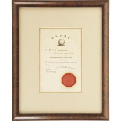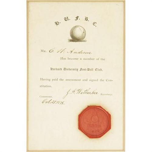 <B>1875 Harvard University Football Club Membership Certificate.</B></I> Seminal document is among the very earliest American football pieces ever to be offered at public auction. Though most historians point to an 1869 contest between Rutgers and Princeton as the first ever football game in the United States, this match was played under rugby-style Association rules, which bore only passing resemblance to the sport as we know it. The first to utilize rules far more closely approximating those which are in place today found Harvard hosting Tufts University on June 4, 1875 at Cambridge, Massachusetts' Jarvis Field, just four months before this certificate was issued. This new style, featuring an egg-shaped ball, eleven men on a side, and the concept of tackling to impede the progress of the offense came to be known as "The Boston Game" due to its Harvard roots.<BR><BR>Elegant in its simplicity, this 5x7.5" certificate begins with the letters "H.U.F.B.C." arching over an early spherical football, and goes on to attest, "Mr. C.W. Andrews Has become a member of the Harvard University Foot-Ball Club, Having paid the assesment and signed the Constitution. (Signed) J.A. Wetherbee, Secretary, Cambridge, Oct. 28, 1876." A wax seal at lower right features another image of a spherical football with the latin phrase "Semper Surgens" (translation, "Forever Rising") and "H.F.B.C. 1873." Short of the lightest hints of foxing, the certificate remains in splendid, undamaged condition, free of any creases, tears or stains that are all but ensured with a paper artifact of this vintage. The certificate is tastefully matted and framed to final dimensions of 11.5x14". A marvelous piece with the scarcity and relevance to attract the most serious of football collectors.<BR><BR><b>Shipping:</b> Framed - with Glass, Small (<a target="_blank" href="http://www.heritageauctions.com/common/shipping.php">view shipping information</a>)