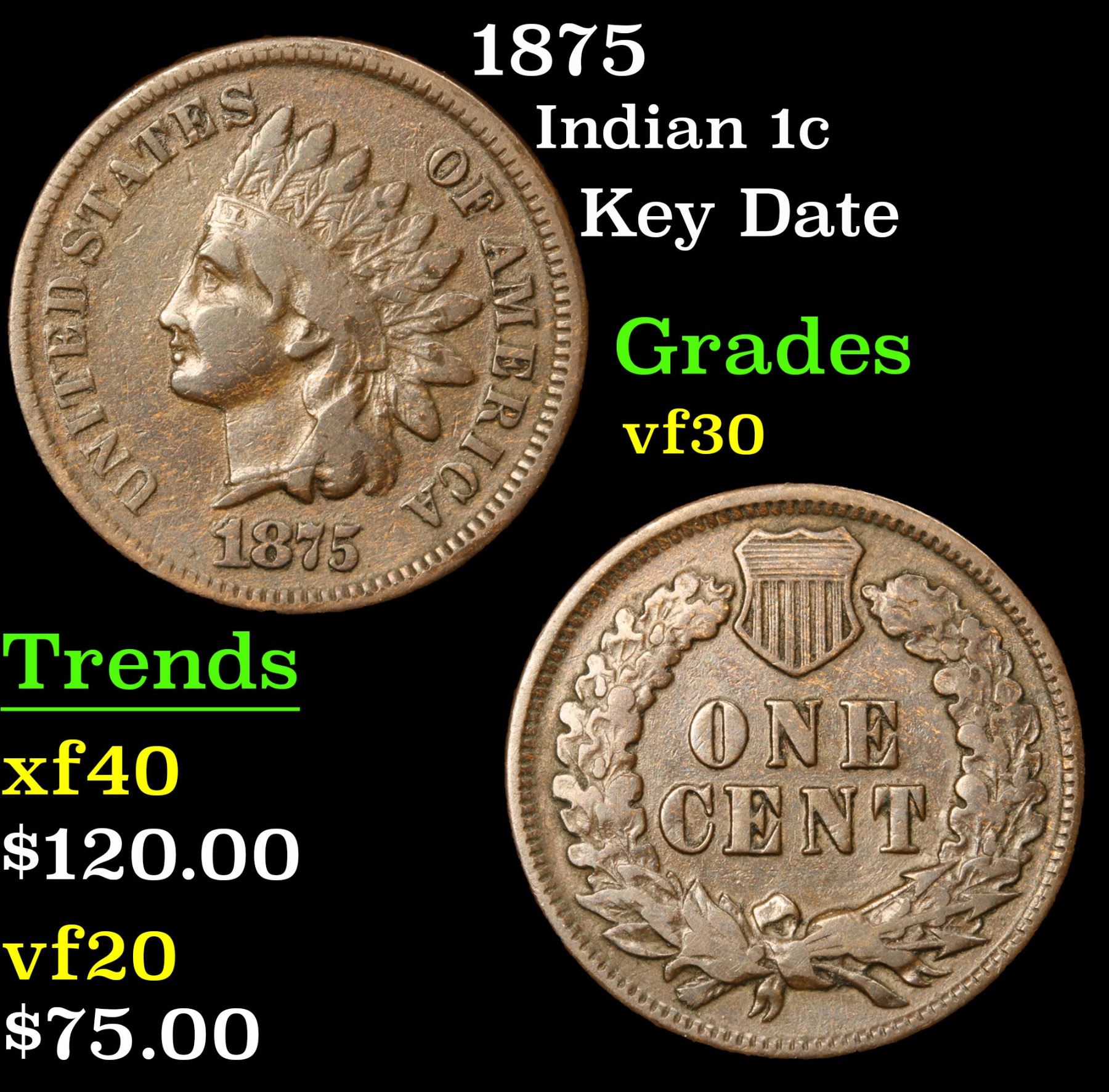 1875 Indian Cent 1c Grades vf++. According to Jaime Hernandez from PCGS, ÔThe 1875 Indian Cent is one of the scarcer issues in the series. This date gravitates more towards being one of the lower mintage issues in the series. Very scarce. With an original mintage of over 13.5 million; PCGS estimates that only 4000 survive in all grades. Key Date