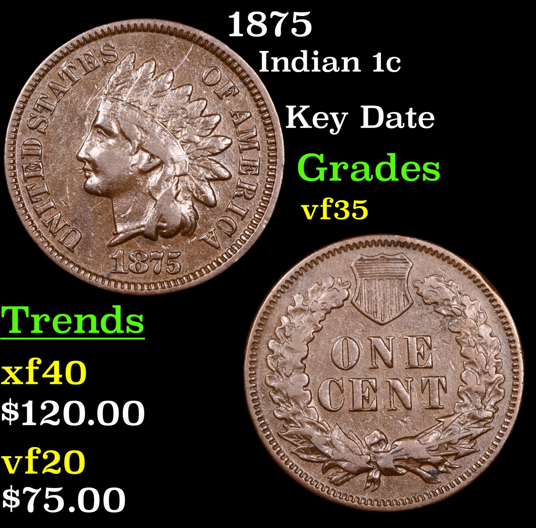 1875 Key Date . Indian Cent 1c Grades vf++. According to Jaime Hernandez from PCGS, ‘The 1875 Indian Cent is one of the scarcer issues in the series. This date gravitates more towards being one of the lower mintage issues in the series. Very scarce. With an original mintage of over 13.5 million; PCGS estimates that only 4000 survive in all grades.