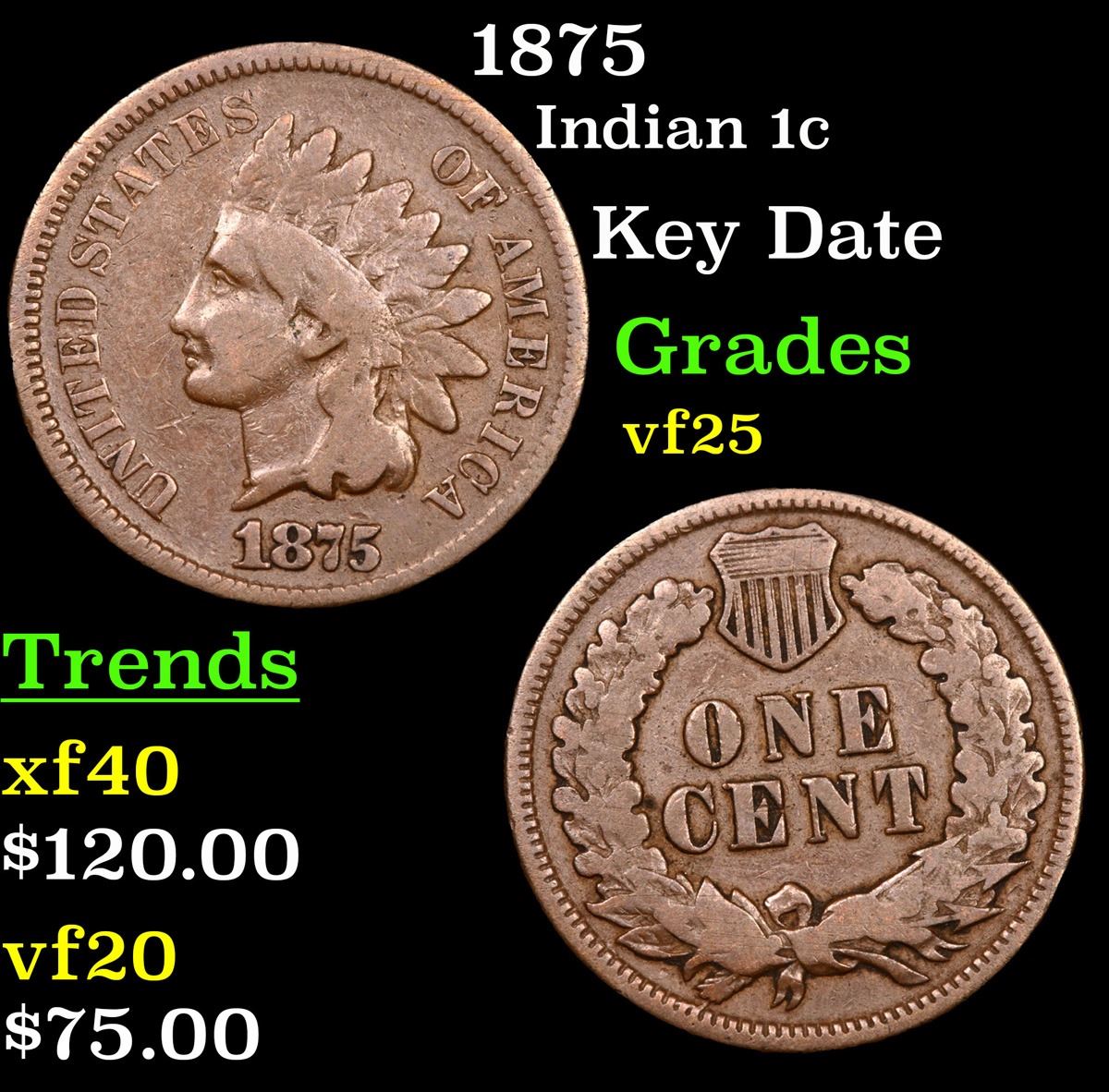 1875 Key Date . Indian Cent 1c Grades vf+. According to Jaime Hernandez from PCGS, ‘The 1875 Indian Cent is one of the scarcer issues in the series. This date gravitates more towards being one of the lower mintage issues in the series. Very scarce. With an original mintage of over 13.5 million; PCGS estimates that only 4000 survive in all grades.