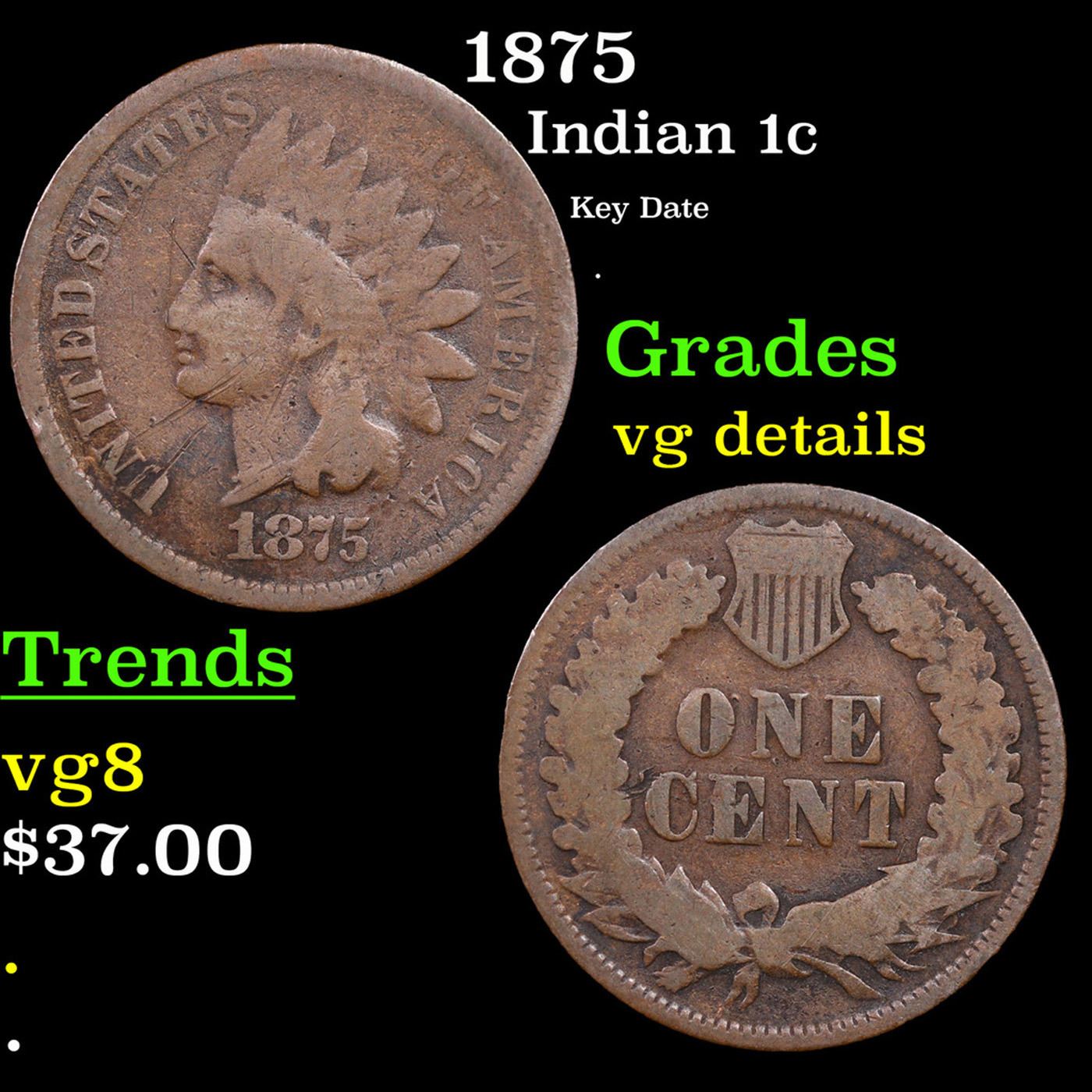 1875 Indian Cent 1c Grades vg details. According to Jaime Hernandez from PCGS, ‘The 1875 Indian Cent is one of the scarcer issues in the series. This date gravitates more towards being one of the lower mintage issues in the series. Very scarce. With an original mintage of over 13.5 million; PCGS estimates that only 4000 survive in all grades.