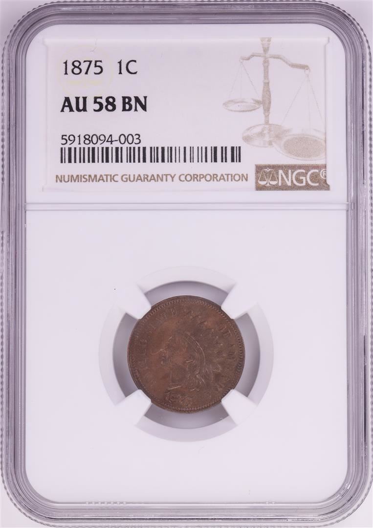 One 1875 Indian Head Cent Coin NGC AU58BN. NGC Certified.