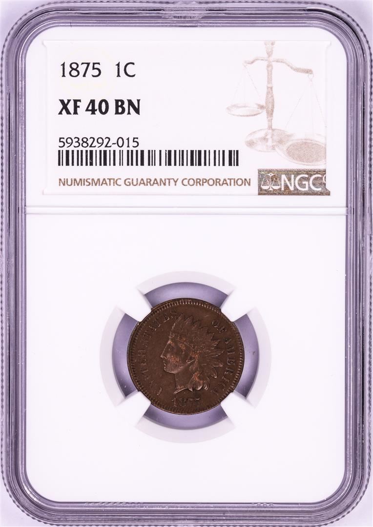 One 1875 Indian Head Cent Coin NGC XF40BN. NGC Certified.