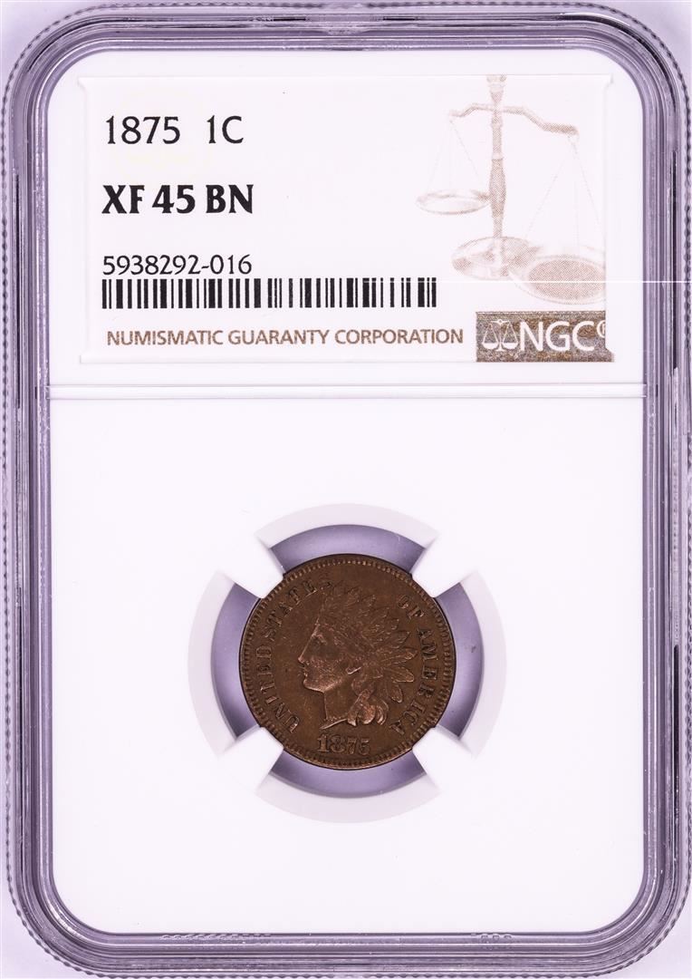 One 1875 Indian Head Cent Coin NGC XF45BN. NGC Certified.