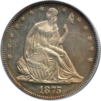 1875 Liberty Seated Half Dollar. PCGS graded Proof 65. A well struck Gem with uniform light golden sunset toning on both sides. Most coins of this date are less than fully struck, business issues as well as the Proofs; some are much better, however, and collectors, true to form, wish that all could be like this handsomely struck 1875 half dollar exhibiting as it does fine detail to all the high points, including the stars and legends. Only 700 Proofs struck. Pop 21; 4 in 66, 1 in 67 (PCGS # 6436) .