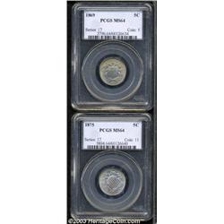 <TABLE cellSpacing=0 cellPadding=0 width="100%" bgColor=#000000 border=0><TBODY><TR><TD width="100%"><TABLE cellSpacing=1 cellPadding=3 width="100%" border=0><TBODY><TR><TD width="100%" bgColor=#79735c><FONT face=arial color=#ffffff size=3><B>Description</B> </FONT></TD></TR><TR><TD width="100%" bgColor=#ffffff><FONT face=arial size=2><B>1869 5C MS64 PCGS,</B></I> the 1 in the date is lightly repunched south, impressive aqua, gold, and rose patina, a decent strike; and an <B>1875 MS64 PCGS,</B></I> the date has minor strike doubling, a lustrous and sharply struck piece with splendid peach and powder-blue colors. (2 coins) </FONT></TD></TR></TBODY></TABLE></TD></TR></TBODY></TABLE><BR><A name=PricesRealized></A><TABLE cellSpacing=0 cellPadding=0 width="100%" bgColor=#000000 border=0><TBODY><TR><TD width="100%"><TABLE cellSpacing=1 cellPadding=3 width="100%" border=0><TBODY><TR><TD width="100%" bgColor=#79735c><A name=PR><FONT face=arial color=#ffffff size=3><B>Previous Prices from Heritage Auctions</B> </FONT></A></TD></TR><TR><TD bgColor=#f6f6ed><TABLE cellSpacing=0 cellPadding=0 width="100%" border=1><TBODY><TR><TD align=middle width="33%"><B>Date</B></TD><TD align=middle width="33%"><B>Service</B></TD><TD align=middle width="33%"><B>Price</B></TD></TR><TR bgColor=whitesmoke><TD width="33%"><B>11/21/1997</B></TD><TD width="33%">PCGS</TD><TD width="33%">$165.00</TD></TR><TR bgColor=whitesmoke><TD width="33%"><B>06/07/2000</B></TD><TD width="33%">PCGS</TD><TD width="33%">$195.50</TD></TR><TR bgColor=whitesmoke><TD width="33%"><B>10/04/1997</B></TD><TD width="33%">PCGS</TD><TD width="33%">$192.50</TD></TR><TR bgColor=whitesmoke><TD width="33%"><B>06/05/2001</B></TD><TD width="33%">NGC</TD><TD width="33%">$170.00</TD></TR><TR bgColor=whitesmoke><TD width="33%"><B>05/19/1995</B></TD><TD width="33%">NGC</TD><TD width="33%">$154.00</TD></TR><TR bgColor=whitesmoke><TD width="33%"><B>05/27/2003</B></TD><TD width="33%">NGC</TD><TD width="33%">$230.00</TD></TR></TBODY></TABLE></TD></TR><TR><TD bgColor=#ffffff><FONT face=arial size=1 ?>PLEASE NOTE: All prices realized reflect the final hammer price PLUS the buyer's premium in auctions that charge a buyer's premium. Each item has a notation at the top of the listing indicating whether that lot included a buyer's premium. Example: A item that sells with a final hammer price of $100 and a 20% buyer's premium will display with a price realized of $120. All information listed is intended to be as accurate as possible, but errors are possible. Please use this guide carefully and inform us of any inaccuracies. </FONT></TD></TR></TBODY></TABLE></TD></TR></TBODY></TABLE><BR><TABLE cellSpacing=0 cellPadding=0 width="100%" bgColor=#000000 border=0><TBODY><TR><TD width="100%"><TABLE cellSpacing=1 cellPadding=3 width="100%" border=0><TBODY><TR><TD width="100%" bgColor=#79735c colSpan=6><FONT face=arial color=#ffffff size=3><B>Price Guide*</B> </FONT></TD></TR><TR bgColor=#f6f6ed><TD align=middle><B>Grade</B> </TD><TD align=middle><B>Coin World<BR>(Trends)</B> </TD><TD align=middle><B>Numismedia<BR>Retail</B> </TD><TD align=middle><B>Numismedia<BR>Wholesale</B> </TD><TD align=middle><B>Coin<BR>Universe</B> </TD><TD align=middle><B>Heritage<BR>Value Index</B> </TD></TR><TR><TD colSpan=6>No Pricing Data Available</TD></TR><TR bgColor=#ffffff><TD colSpan=6><FONT size=1>*All information listed is intended to be as accurate as possible, but errors are possible. No item may be returned or refused based on this information which is provided as a service to our customers. You should contact each pricing source directly to determine the accuracy of this information. </FONT></TD></TR></TBODY></TABLE></TD></TR></TBODY></TABLE><BR><TABLE cellSpacing=0 cellPadding=0 width="100%" bgColor=#000000 border=0><TBODY><TR><TD width="100%"><TABLE cellSpacing=1 cellPadding=3 width="100%" border=0><TBODY><TR><TD width="100%" bgColor=#79735c><FONT face=arial color=#ffffff size=3><B>Population Guide</B> </FONT></TD></TR><TR bgColor=#ffffff><TD align=middle><!-- Begin Output of Population Grid--><TABLE cellSpacing=0 cellPadding=0 width="100%" border=0><TBODY><TR><TD vAlign=center><TABLE cellSpacing=0 width="100%" border=1 cellsadding="3"><TBODY><TR><TD vAlign=center><TABLE cellSpacing=0 cellPadding=3 width="100%" border=1><TBODY><TR><TD vAlign=center align=middle bgColor=#f0f1e8 colSpan=2 <CENTER><FONT face=Arial size=2><B>PCGS Pop </B></FONT><CENTER></CENTER></TD><TD vAlign=center align=middle bgColor=#f0f1e8 colSpan=2><CENTER><FONT face=Arial size=2><B>NGC Pop</B></CENTER></FONT></TD></TR><TR><TD vAlign=center><FONT face=Arial size=2>(64)</FONT> </TD><TD vAlign=center align=right><FONT face=Arial size=2>104</FONT> </TD><TD vAlign=center><FONT face=Arial size=2>(64)</FONT> </TD><TD vAlign=center align=right><FONT face=Arial size=2>105</FONT> </TD></TR><TR><TD vAlign=center><FONT face=Arial size=2>(>64)</FONT> </TD><TD vAlign=center align=right><FONT face=Arial size=2>47</FONT> </TD><TD vAlign=center><FONT face=Arial size=2>(>64)</FONT> </TD><TD vAlign=center align=right><FONT face=Arial size=2>83</FONT> </TD></TR></TBODY></TABLE></TD></TR></TBODY></TABLE></TD></TR></TBODY></TABLE><!-- End Output of Population Grid--> 2 coins Important notice: Heritage usually auctions material at the rate of 200-250 lots per hour. On some occasions eBay Live bid software or the Internet may not be able to keep up with the pace of the auction. We recommend placing a realistic absentee bid now as insurance to avoid disappointment. Occasionally the auctioneer may eliminate or reject an eBay Live bid, and the auctioneer may also reopen a lot after the close of the eBay live bidding (usually because we missed an audience bid), and may reject your bid even if it shows you as the winning bidder. By bidding via eBay Live, you agree that Heritage may award the lot to another bidder at its sole discretion under the circumstances described above or any other reasonable circumstances. Also please note that all Herit