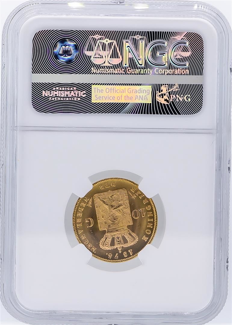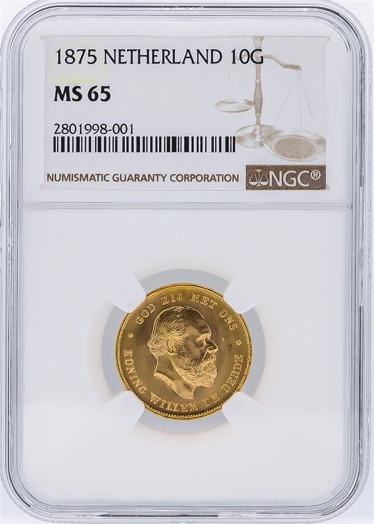 One 1875 NGC MS65 Netherlands 10G Gulden Gold Coin. NGC Certified.