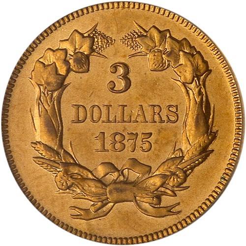 Judd 1437 1875 Three Dollar Gold, the regular dies struck in Aluminum with the usual Reeded Edge and then Gilded. Population estimated at three.
