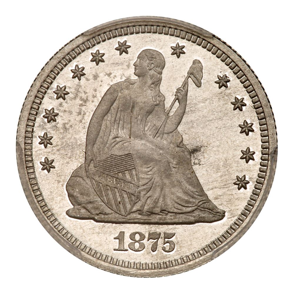 1875 Pattern Quarter Dollar. Aluminum, reeded edge. Judd-1417. Pollock-1560. Rarity 7. PCGS graded Proof 63 Cameo. CAC. The obverse and reverse are the regular dies but a trial piece struck in aluminum, with the usual reeded edge seen on the silver coins of this year. The surfaces show a small area of typical roughness common to these early aluminum coins, which makes for easy plate matching in this case.Pop 1; the only Proof Cameo example graded at PCGS. 1 finer in 63 Deep Cameo is reported in CoinFacts but it is this same coin based on the photographs. Estimated Value 5,000 - UP
