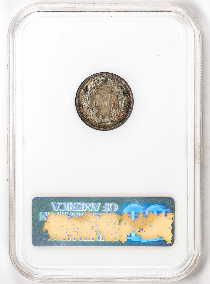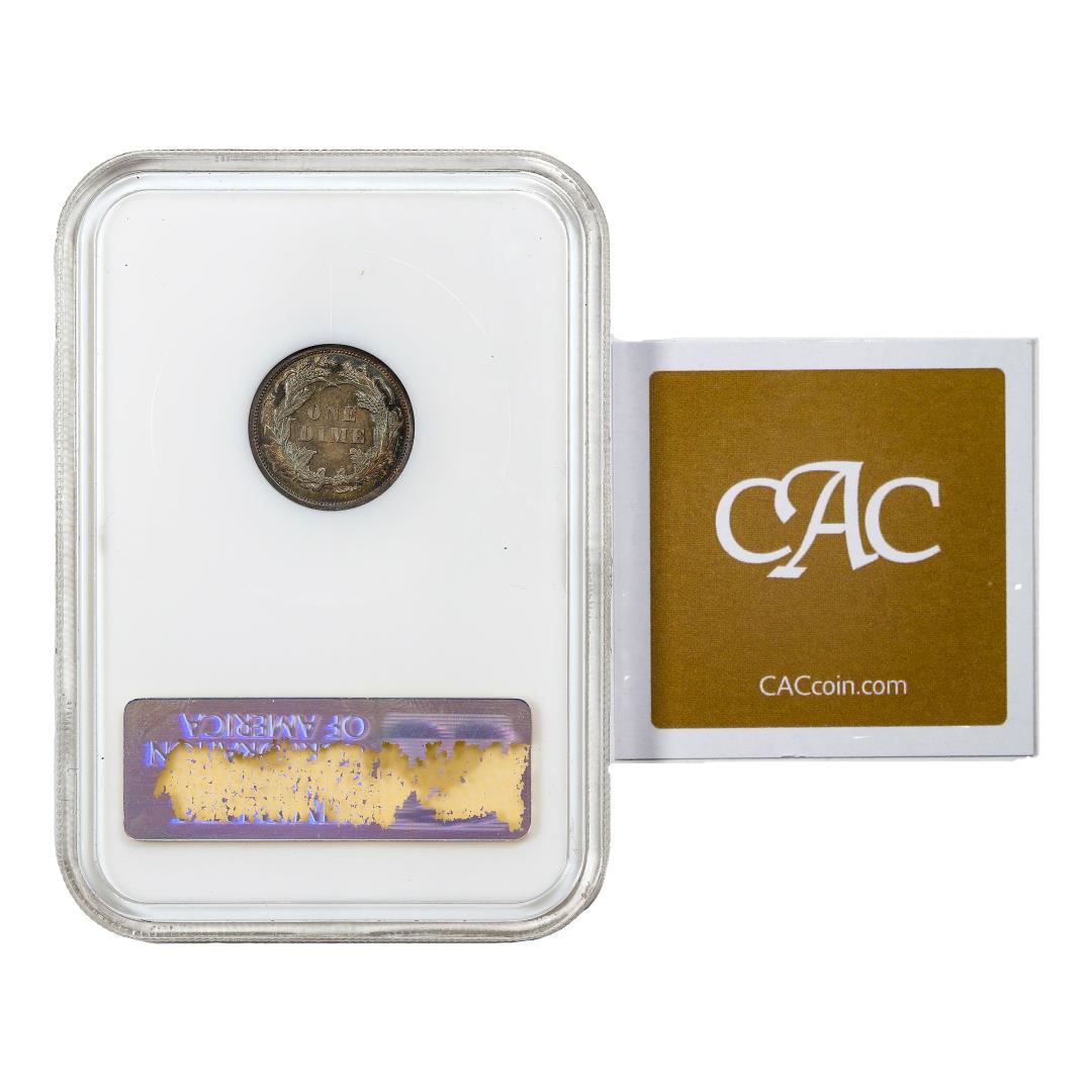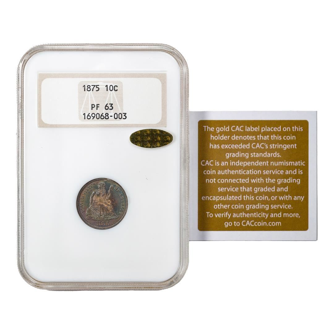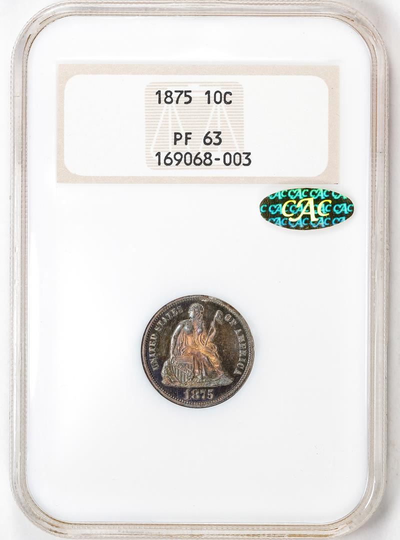 One 1875 Proof Seated Liberty Dime Coin NGC PF63 GOLD CAC Great Toning Old Fatty Holder. NGC Certified.