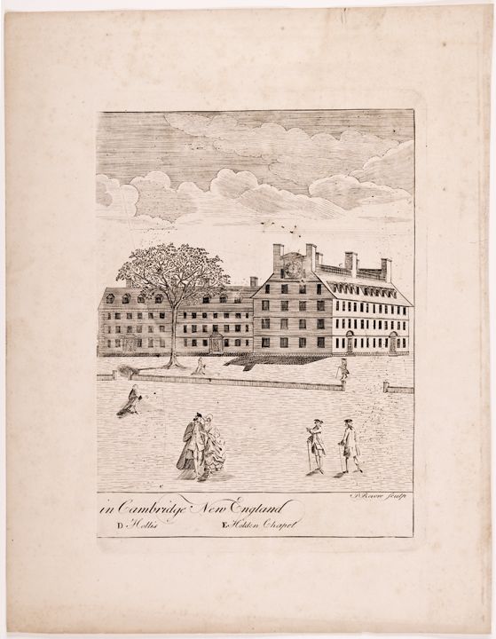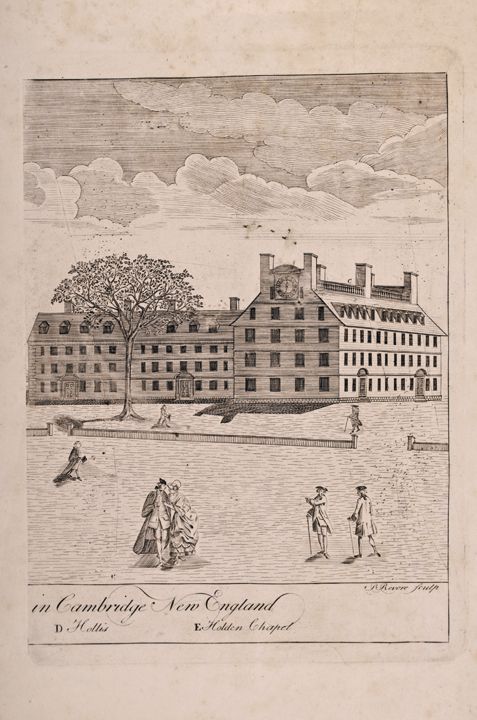 This is an 1875 Restrike from the original Paul Revere Engraved Copper Plate, which was originally produced about 1767. This engraving was done from original artwork by the artist, J. Chadwick, titled, “Harvard College In Cambridge New England.” This right side half of the full print shows: “D. Hollis” and” E. Holden Chapel” plus seven persons walking about. This print was produced from half of the original plate engraved by Paul Revere, and has his name Inscribed as Engraver and identified within matrix, “P Revere Sculp(tor)” at lower right.