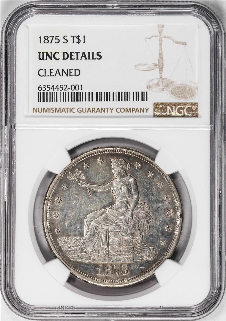 One 1875-S $1 Trade Silver Dollar Coin NGC Unc Details. NGC Certified.