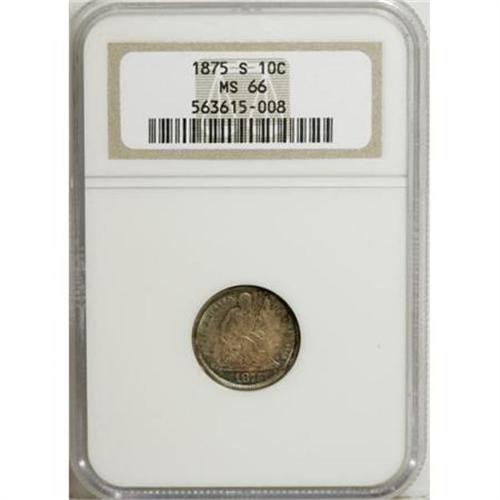 <B>1875-S 10C Mintmark Below Bow MS66 NGC.</B></I> A well struck example of this S-mint Seated dime issue, from the slightly more available Mintmark Below Bow variant. The rich gold, orange, cerulean, and emerald patina of the luminous obverse contrasts with the thinner blue-green peripheral toning and azure center of the reverse. Census: 12 in 66, 1 finer (6/07).<BR><BR><B>Coin Engraver:</B> Christian Gobrecht<BR><BR><b>Shipping:</b> Coins & Currency (<a target="_blank" href="http://www.heritageauctions.com/common/shipping.php">view shipping information</a>)