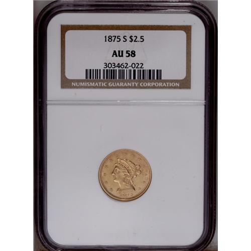 <B>1875-S<$2 1/2> AU58 NGC.</B></I> Scarce in high grades, this is an attractive, semi-prooflike specimen that is generally quite well struck with a few minor handling marks scattered about. Census: 44 in 58, 25 finer (2/06).