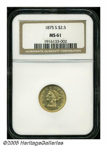 1875-S $2 1/2 MS61 NGC. A scarce, low mintage Qua